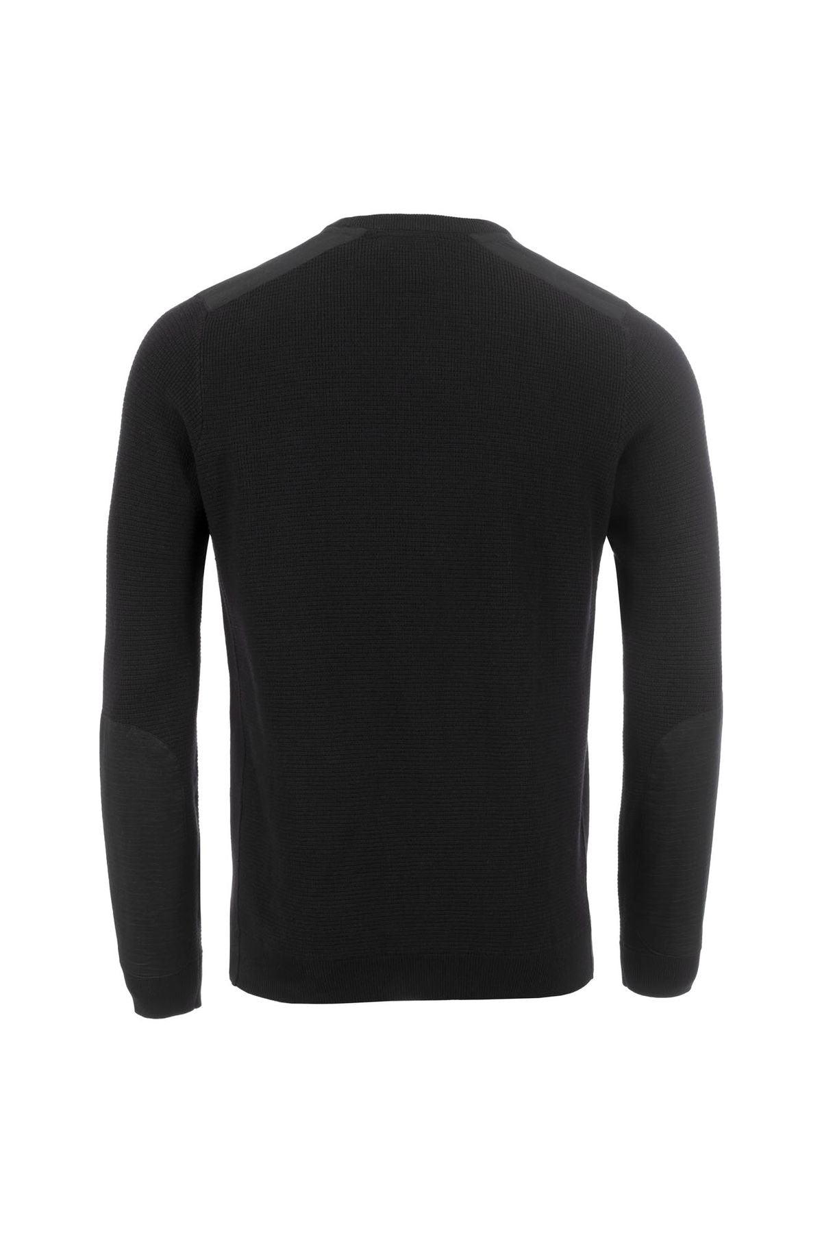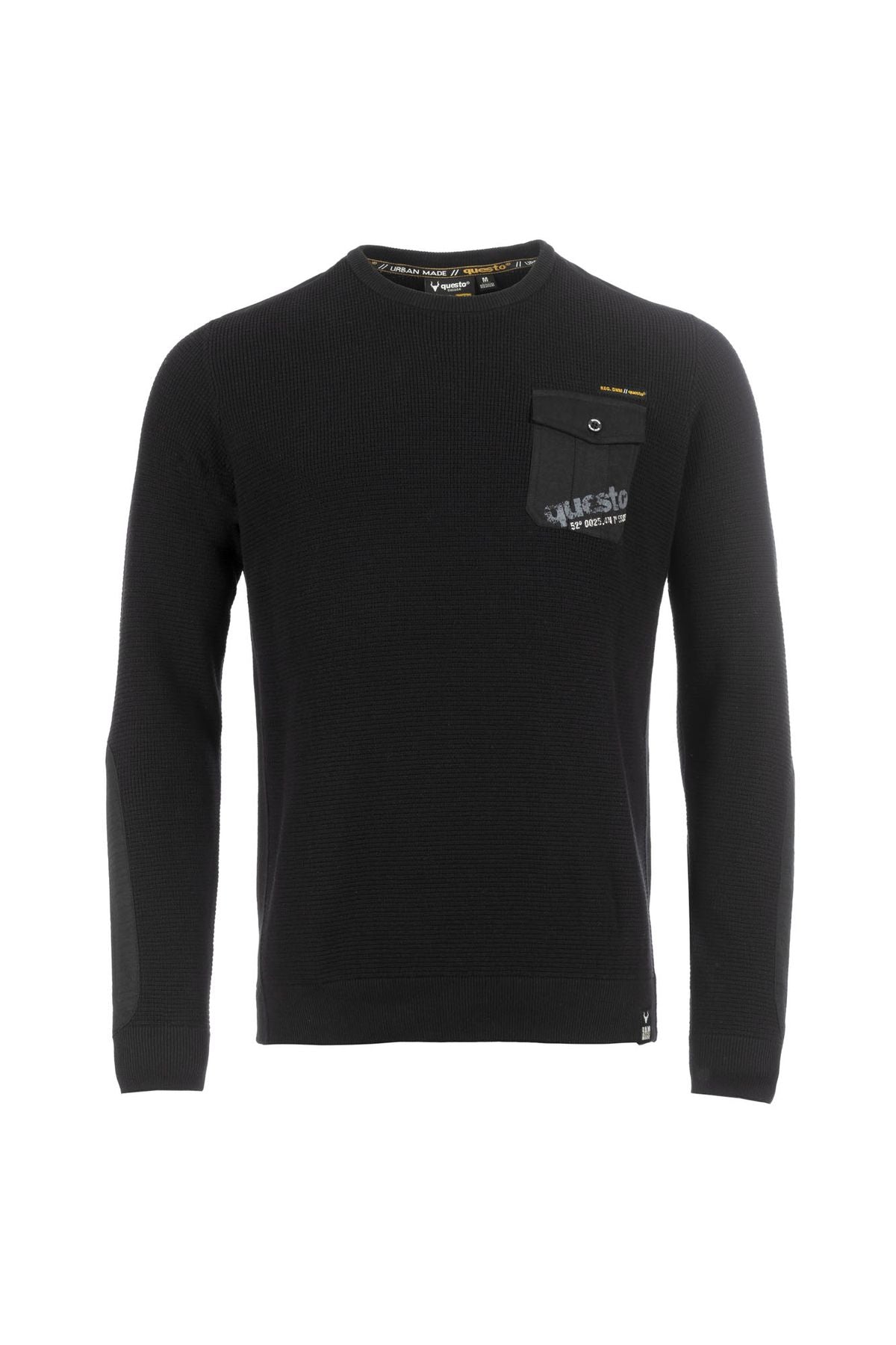 Leichter Strickpullover mit klassischem Rundhalsausschnitt. Webeinsätze an Schultern und Ärmeln sorgen für Struktur, während die aufgesetzte Brusttasche mit Print dem Look eine lässige Note verleiht.