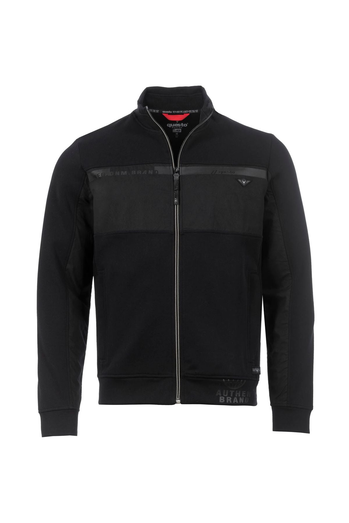 Sportive Sweatjacke mit Stehkragen. Die Brustpartie und Ärmelinnenseiten sind mit schwarzen Webeinsätzen abgesetzt, auf denen sich ein tonaler Questo-Print befindet.