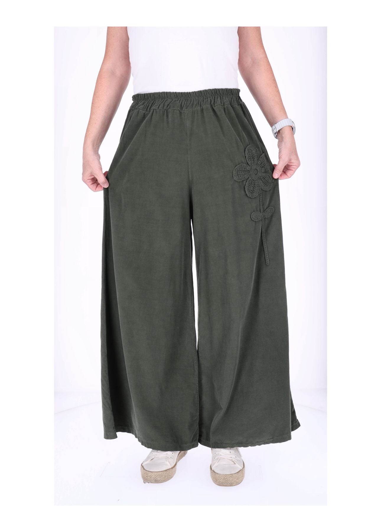 Hose Damen – Weites Bein aus Babycord mit Blumen-Detail