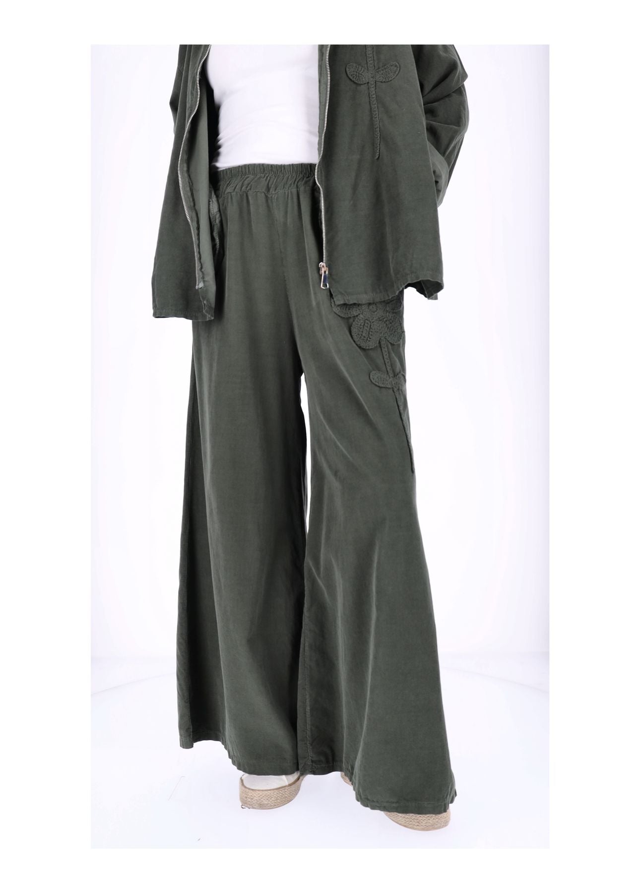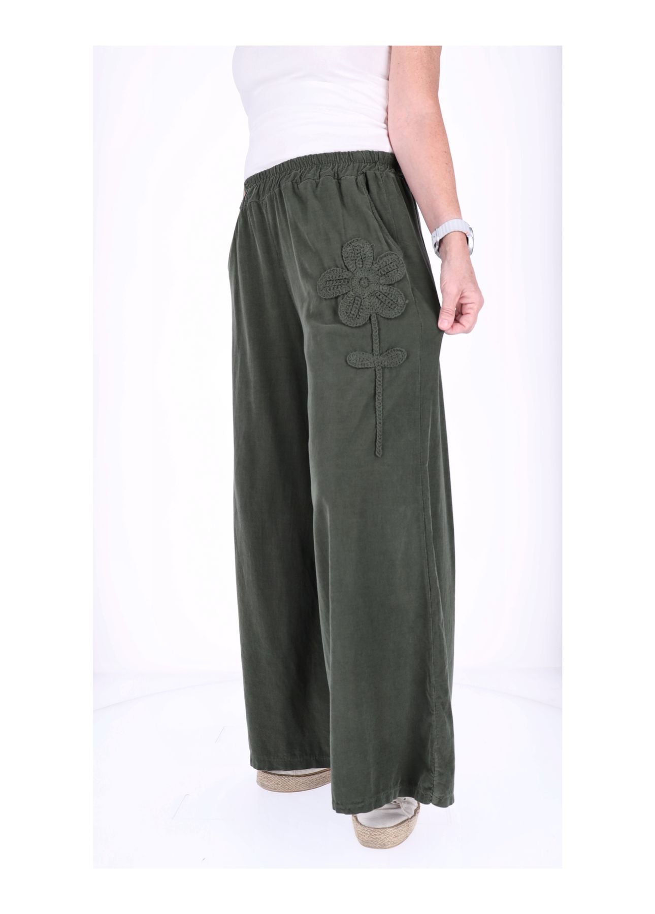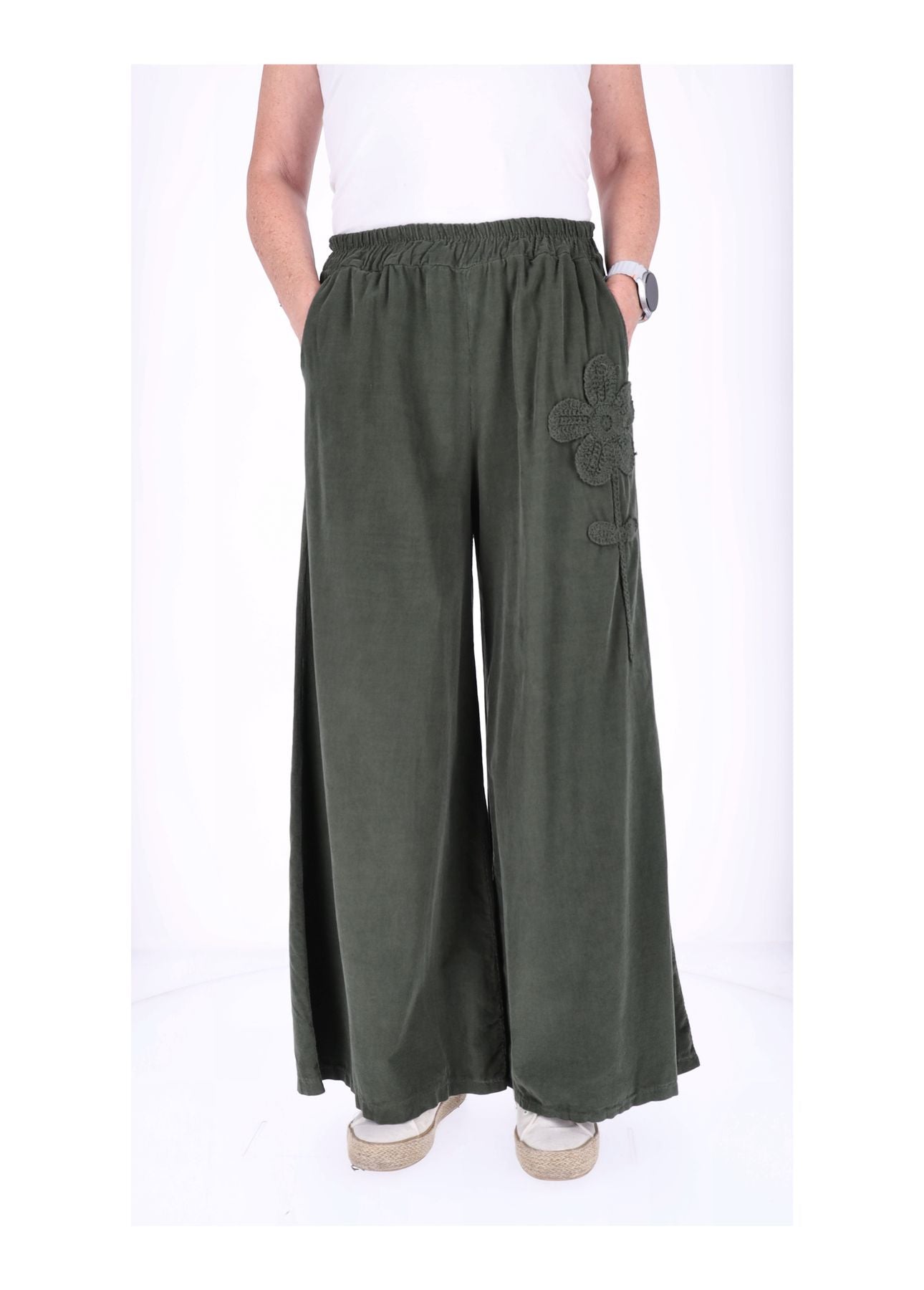 Der bequeme Gummizug in der Taille (halber Bund ungedehnt ca. 33 cm, gedehnt ca. 51 cm) sorgt dafür, dass sie sich perfekt anpasst – kein Zwicken, nur Wohlfühlen! Die weite Beinform schmeichelt jeder Figur und lässt dich mühelos größer wirken. Zwei praktische Taschen vorne links und rechts bieten Platz für Kleinigkeiten, während das liebevolle Blumen-Detail auf der rechten Seite der Hose das gewisse Etwas verleiht.