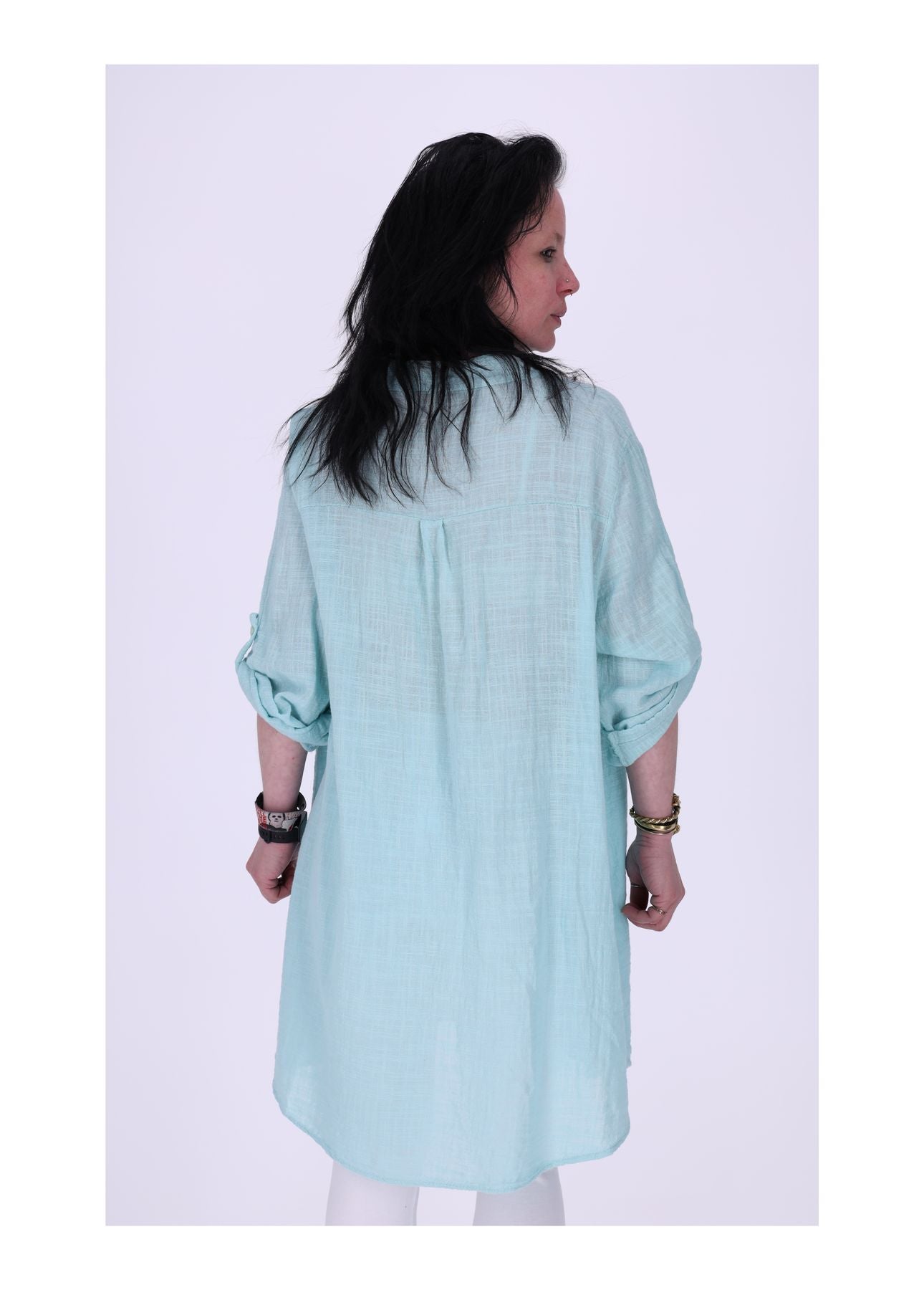 Dieses unifarbene Damen-Longshirt aus einer hochwertigen Baumwoll-Leinen-Mischung ist der perfekte Begleiter für warme Tage. Der V-Ausschnitt mit kurzer Knopfleiste verleiht dem Shirt eine feminine Note, während die krempelbaren Ärmel für lässige Flexibilität sorgen. Die praktische Brusttasche und der abgerundete Saum, der hinten etwas länger geschnitten ist, runden das Design ab. Mit einer halben Brustweite von ca. 64 cm und einer Länge von ca. 68 cm bietet es eine lockere Passform, ideal für Ausflüge oder entspannte Stunden im Garten.