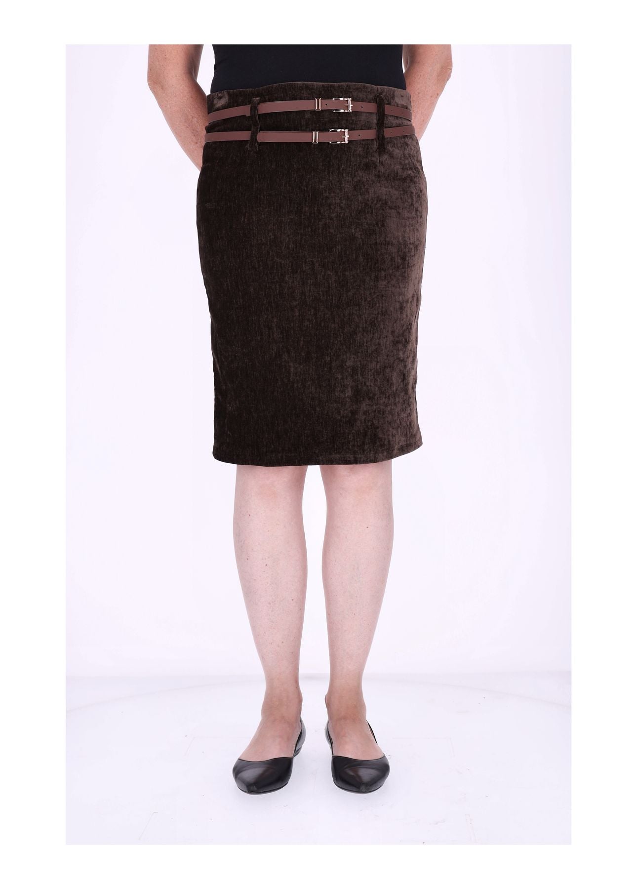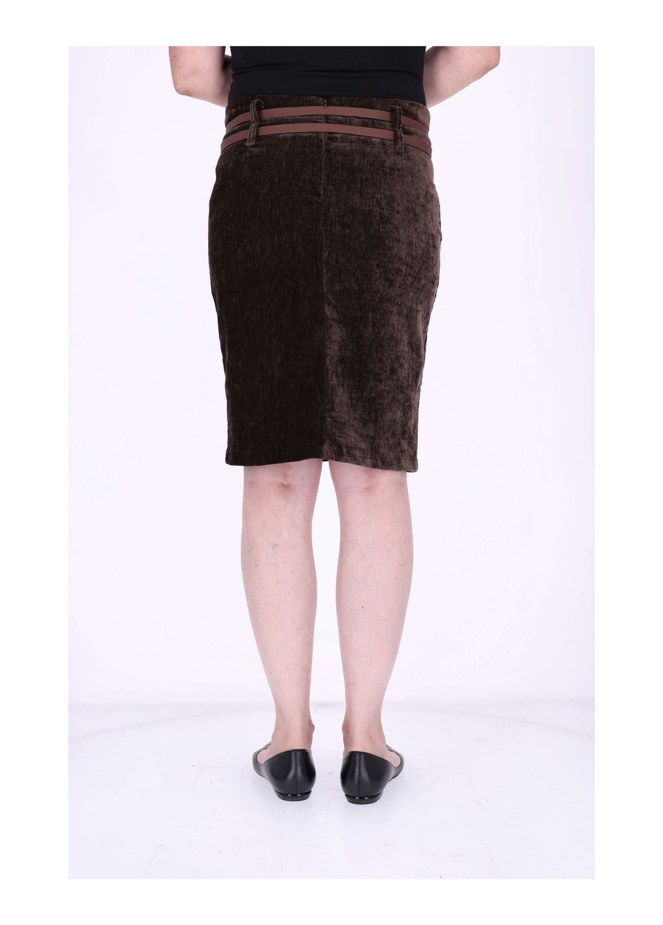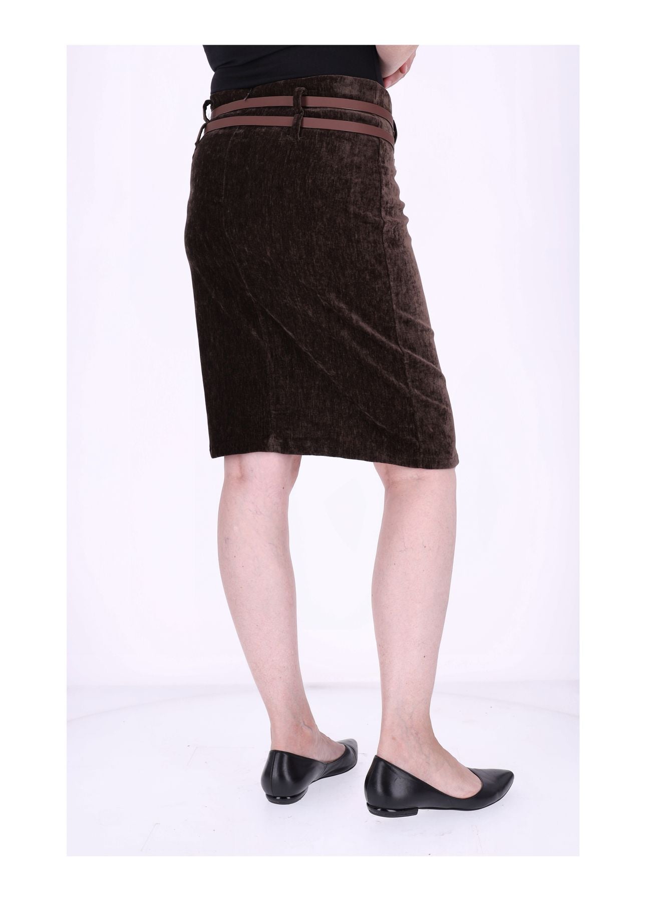 Dieser knielange Damenrock in edler Samt-Optik ist ein echtes Highlight für deine Garderobe. Der luxuriöse Stoff schimmert dezent im Licht und sorgt dafür, dass du dich auf Anhieb elegant, stilvoll und besonders fühlst. Zwei dekorative Gürtel setzen raffinierte Akzente und machen den Rock zu einem absoluten Eyecatcher – perfekt für alle, die das Besondere lieben.