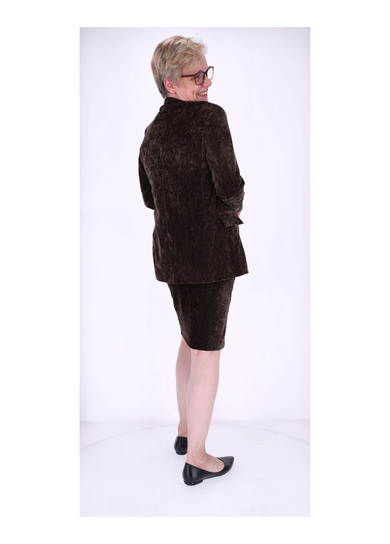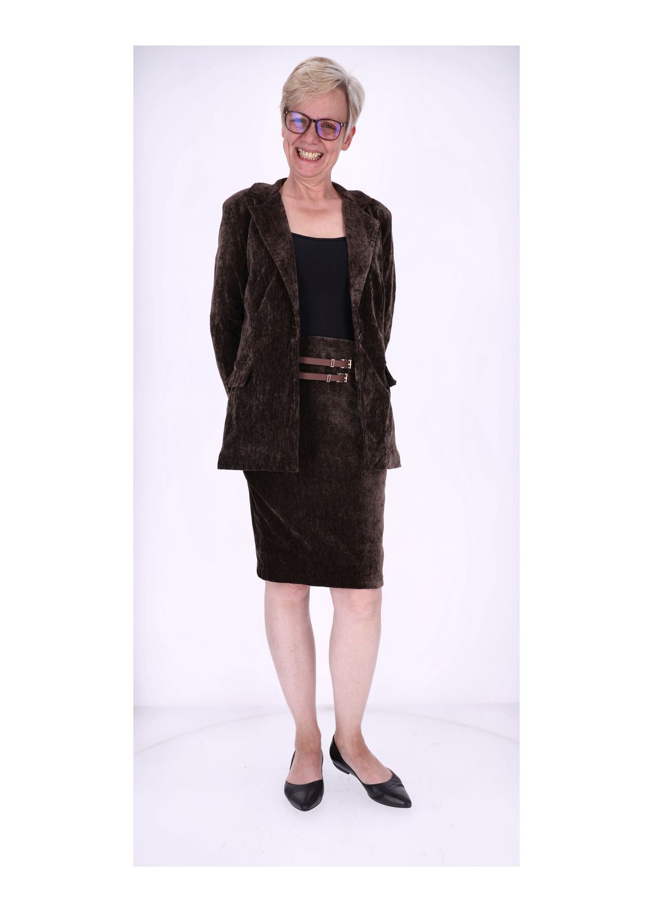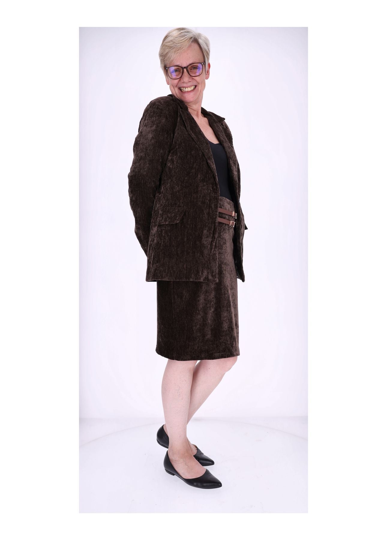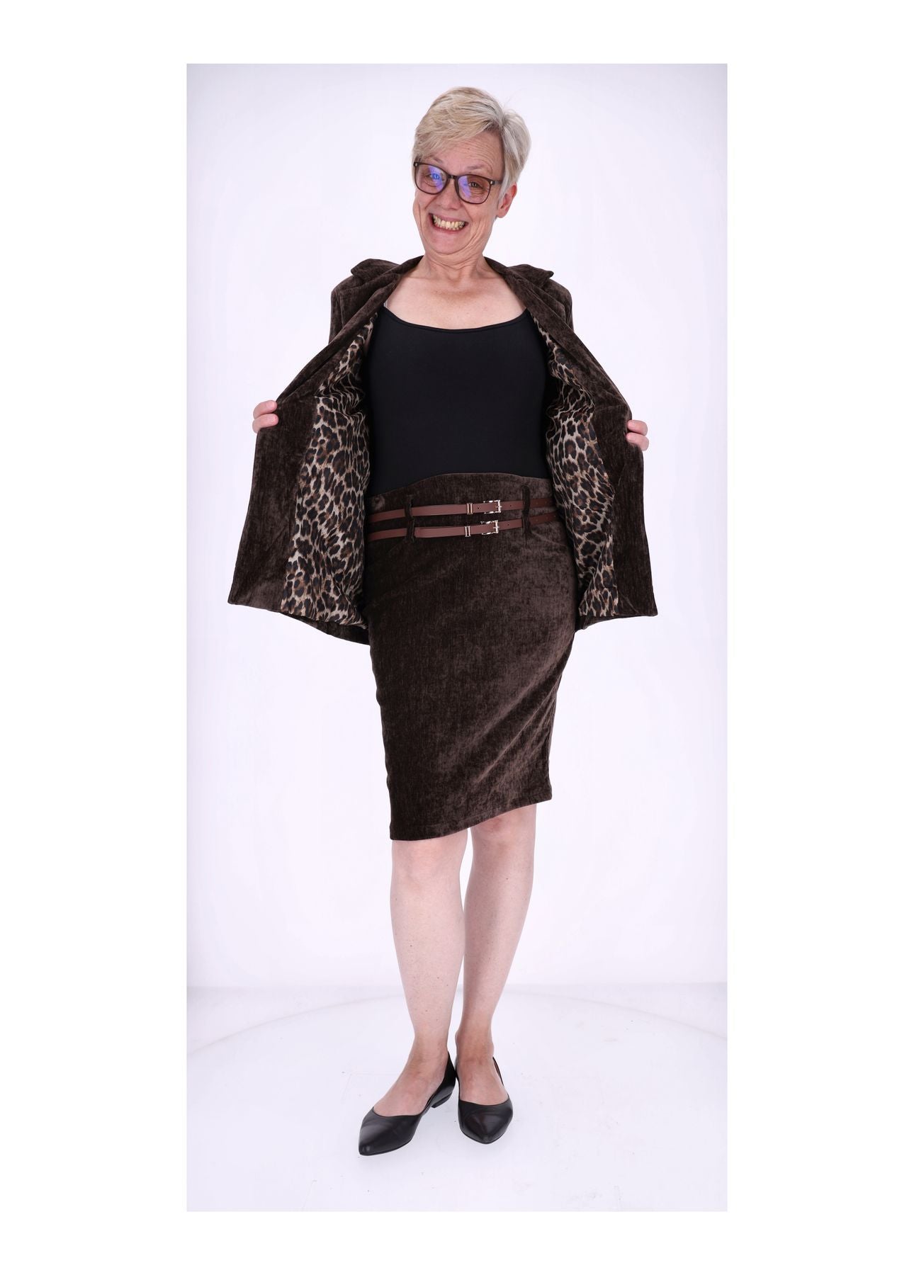Dieser knielange Damenrock in edler Samt-Optik ist ein echtes Highlight für deine Garderobe. Der luxuriöse Stoff schimmert dezent im Licht und sorgt dafür, dass du dich auf Anhieb elegant, stilvoll und besonders fühlst. Zwei dekorative Gürtel setzen raffinierte Akzente und machen den Rock zu einem absoluten Eyecatcher – perfekt für alle, die das Besondere lieben.
