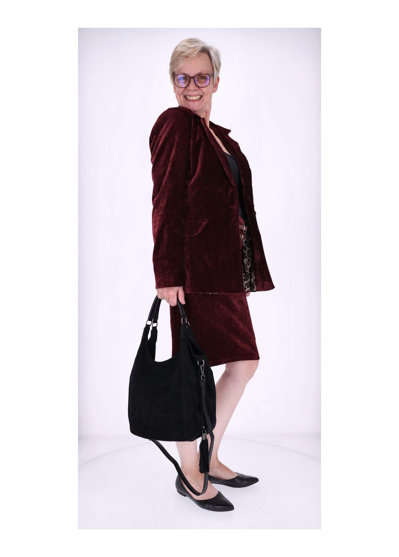 Dieser knielange Damenrock in edler Samt-Optik ist ein echtes Highlight für deine Garderobe. Der luxuriöse Stoff schimmert dezent im Licht und sorgt dafür, dass du dich auf Anhieb elegant, stilvoll und besonders fühlst. Zwei dekorative Gürtel setzen raffinierte Akzente und machen den Rock zu einem absoluten Eyecatcher – perfekt für alle, die das Besondere lieben.
