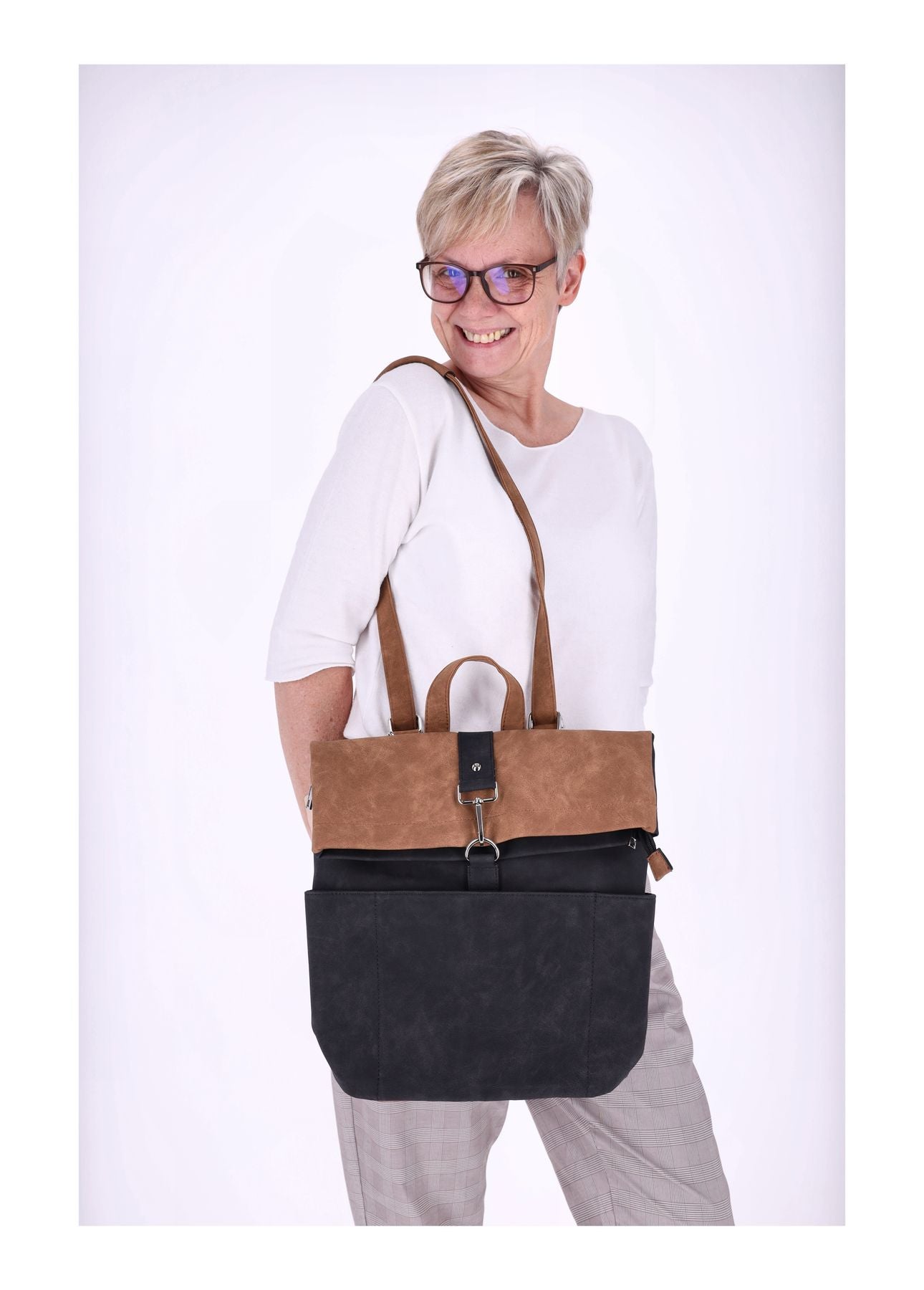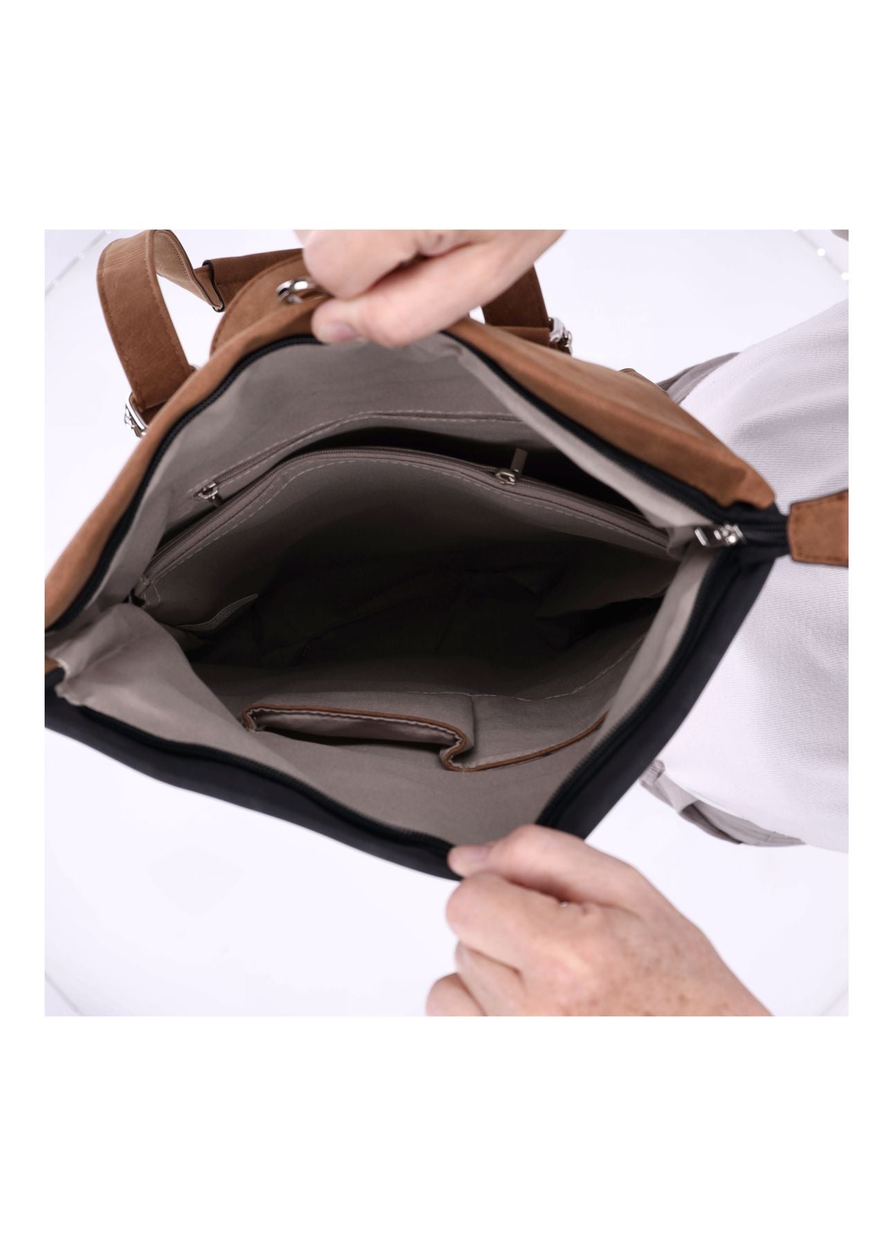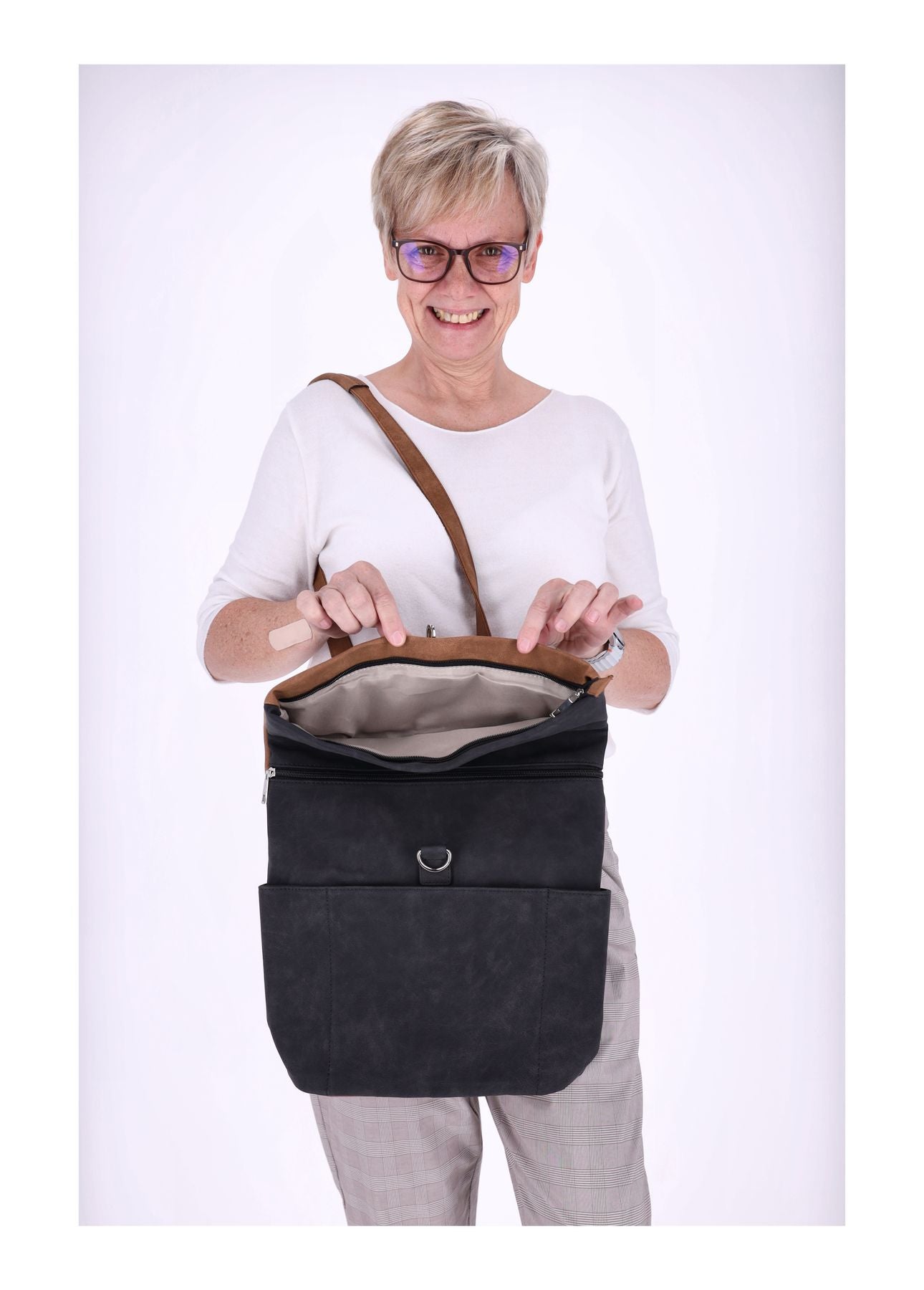 Der Hauptinnenraum überrascht auf ganzer Linie: Einfach das obere Fach hochklappen, den versteckten Reißverschluss öffnen – und schon eröffnet sich ein großzügiges Hauptfach. Auf der einen Seite gibt es zwei offene Fächer, auf der anderen eine Reißverschlusstasche. In der Mitte trennt eine zusätzliche Reißverschlusstasche das Fach clever in zwei Bereiche. So hat alles seinen Platz, bleibt perfekt organisiert und ist jederzeit griffbereit.