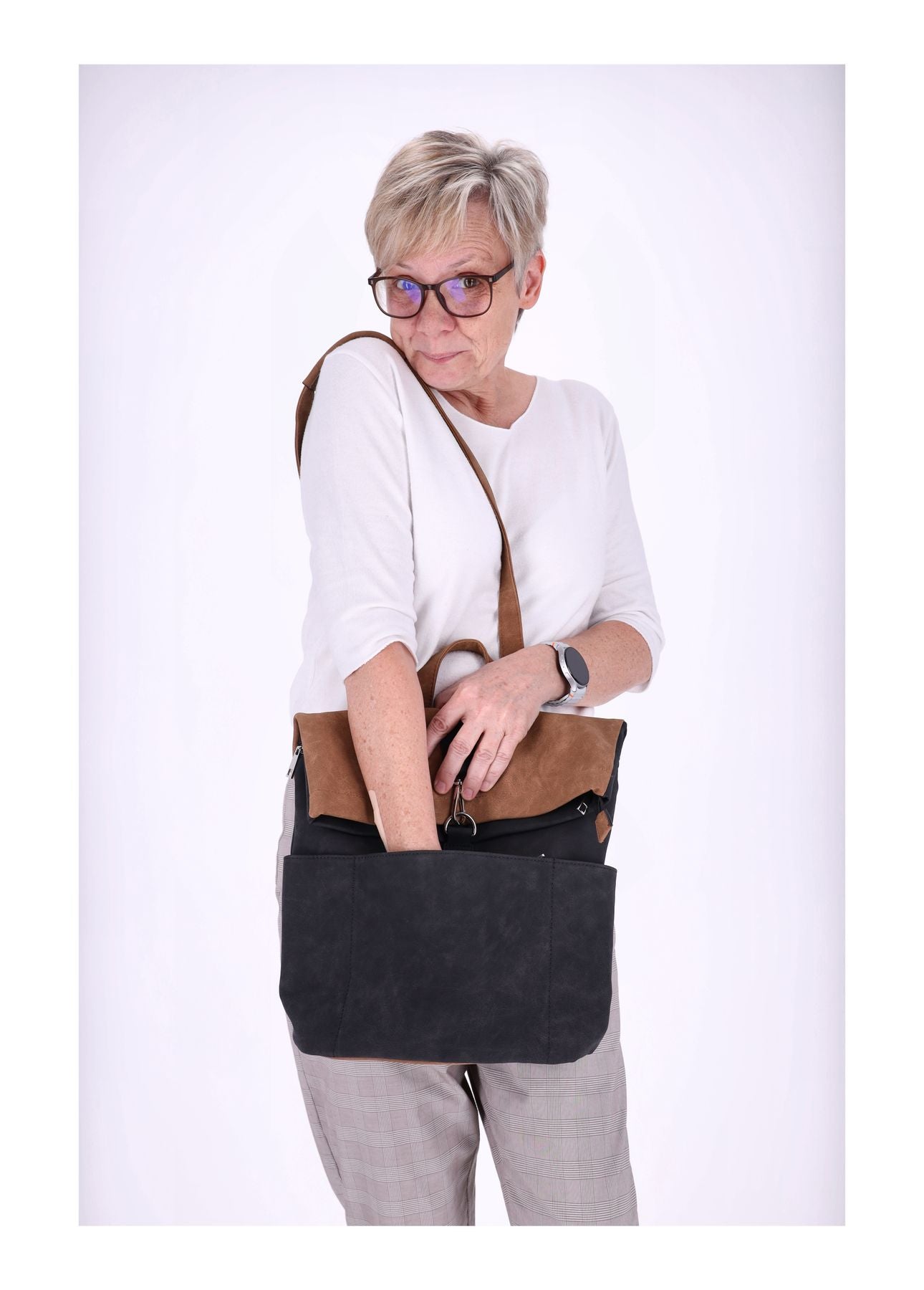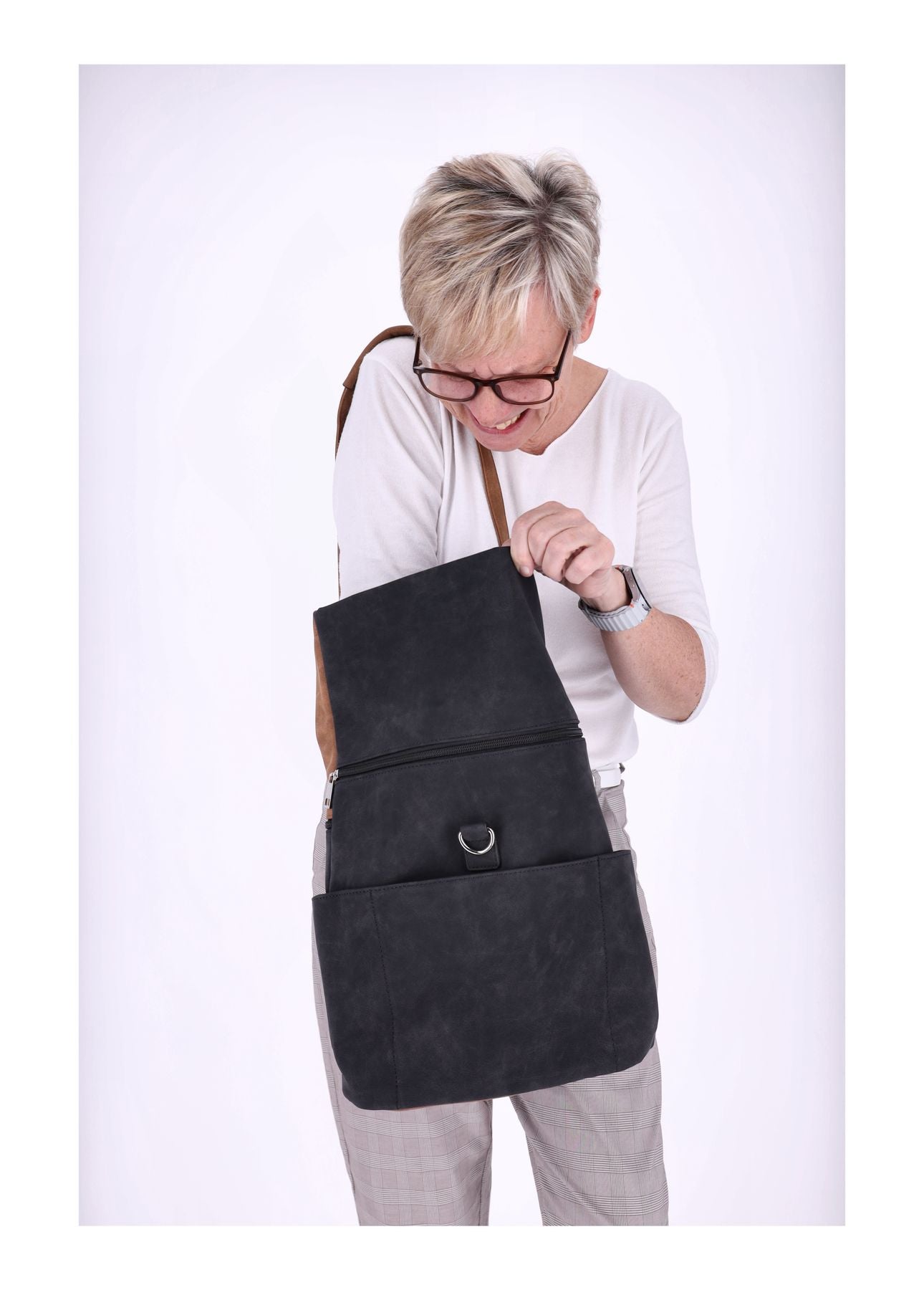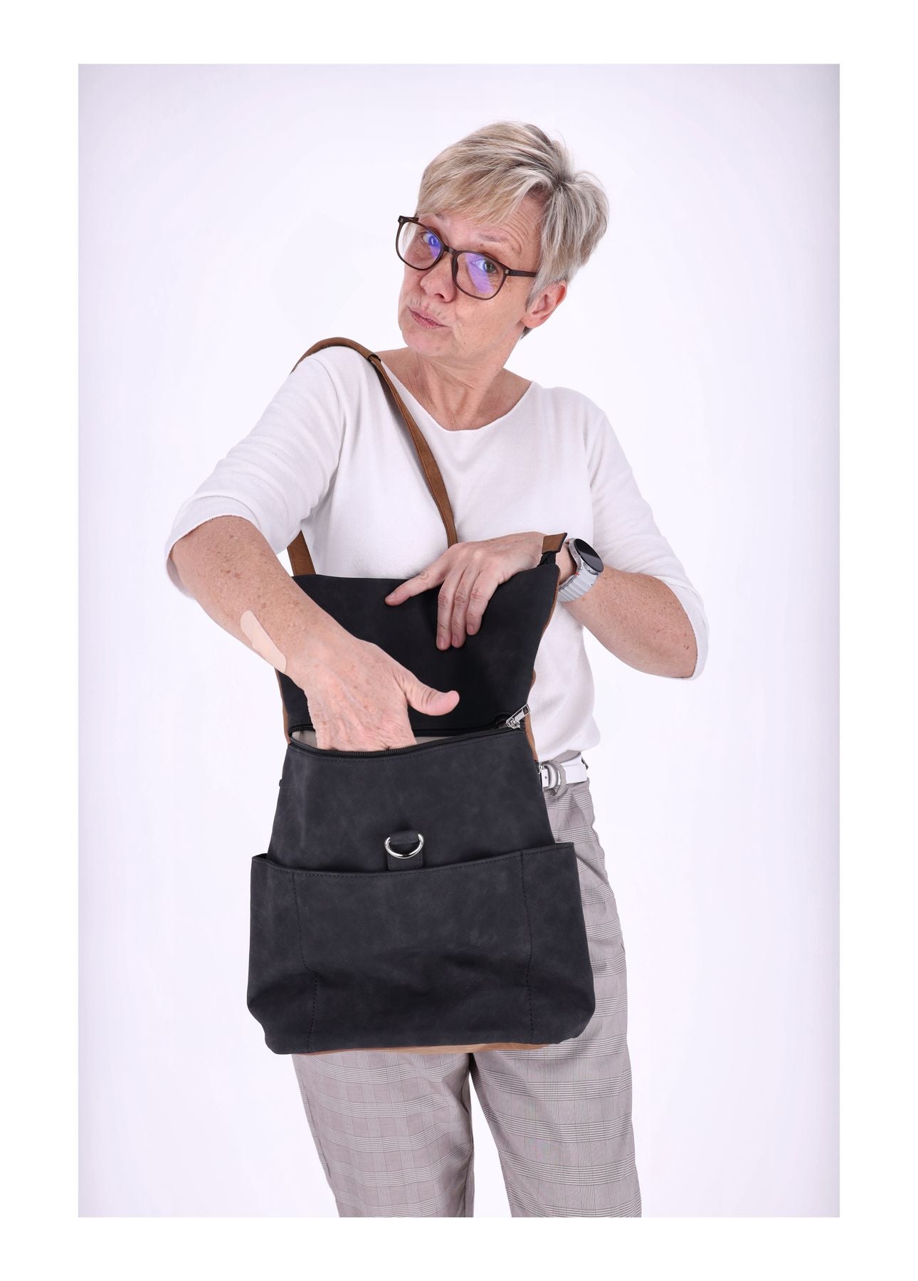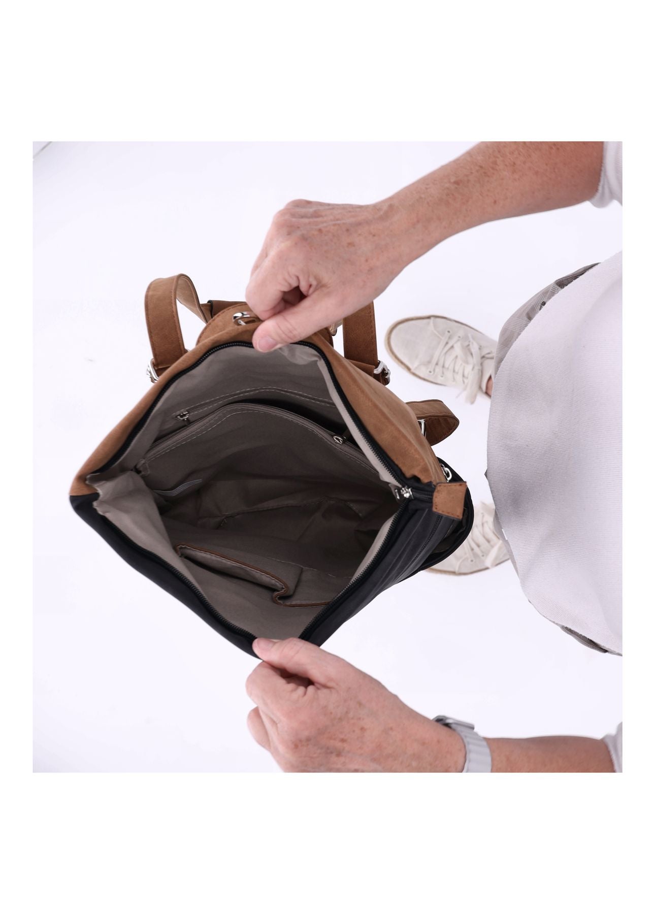 Der Hauptinnenraum überrascht auf ganzer Linie: Einfach das obere Fach hochklappen, den versteckten Reißverschluss öffnen – und schon eröffnet sich ein großzügiges Hauptfach. Auf der einen Seite gibt es zwei offene Fächer, auf der anderen eine Reißverschlusstasche. In der Mitte trennt eine zusätzliche Reißverschlusstasche das Fach clever in zwei Bereiche. So hat alles seinen Platz, bleibt perfekt organisiert und ist jederzeit griffbereit.