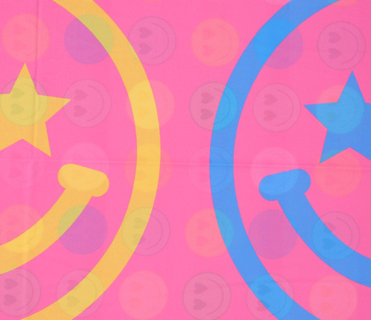 Vorne leuchten drei große Smileys mit Stern-Augen und ziehen alle Blicke auf sich, während die Rückseite von zahlreichen kleinen Smileys mit Herz-Augen fröhlich funkelt. Abgerundet wird das Design durch verspielte Fransen an beiden Enden, die dem Schal einen trendigen, modernen Look verleihen.