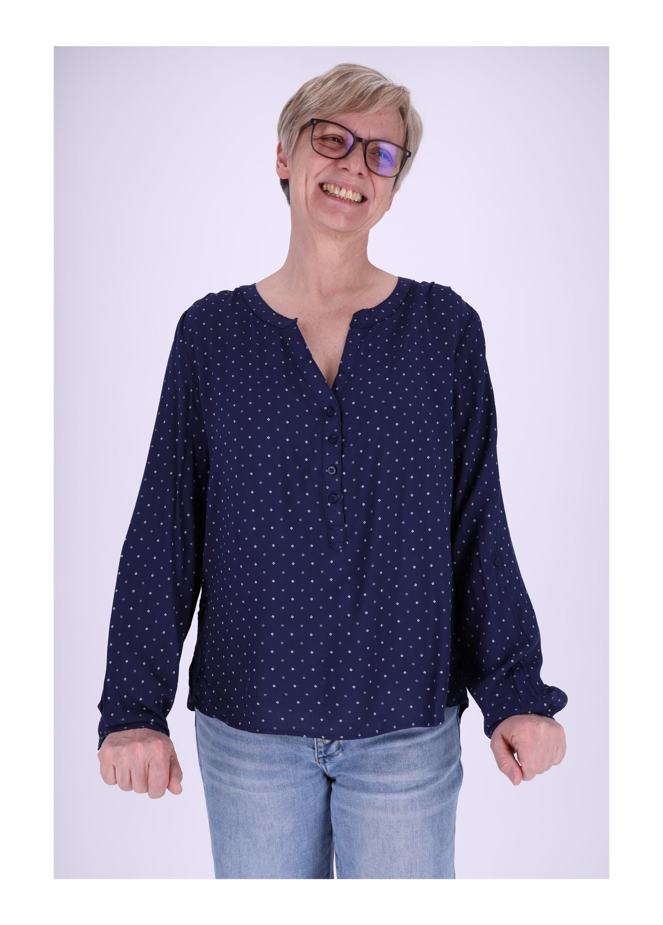 Größenausfall: Dieses Blusenshirt ist bequem geschnitten und kann durchaus eine Größe kleiner getragen werden. Auf den Fotos trage ich meine reguläre Konfektionsgröße 38, die Größe 36 würde mir in dieser Bluse auch gut passen. Wer es also etwas figurbetonter mag kann die kleinere Größe wählen, dann sind die Ärmel auch etwas kürzer.