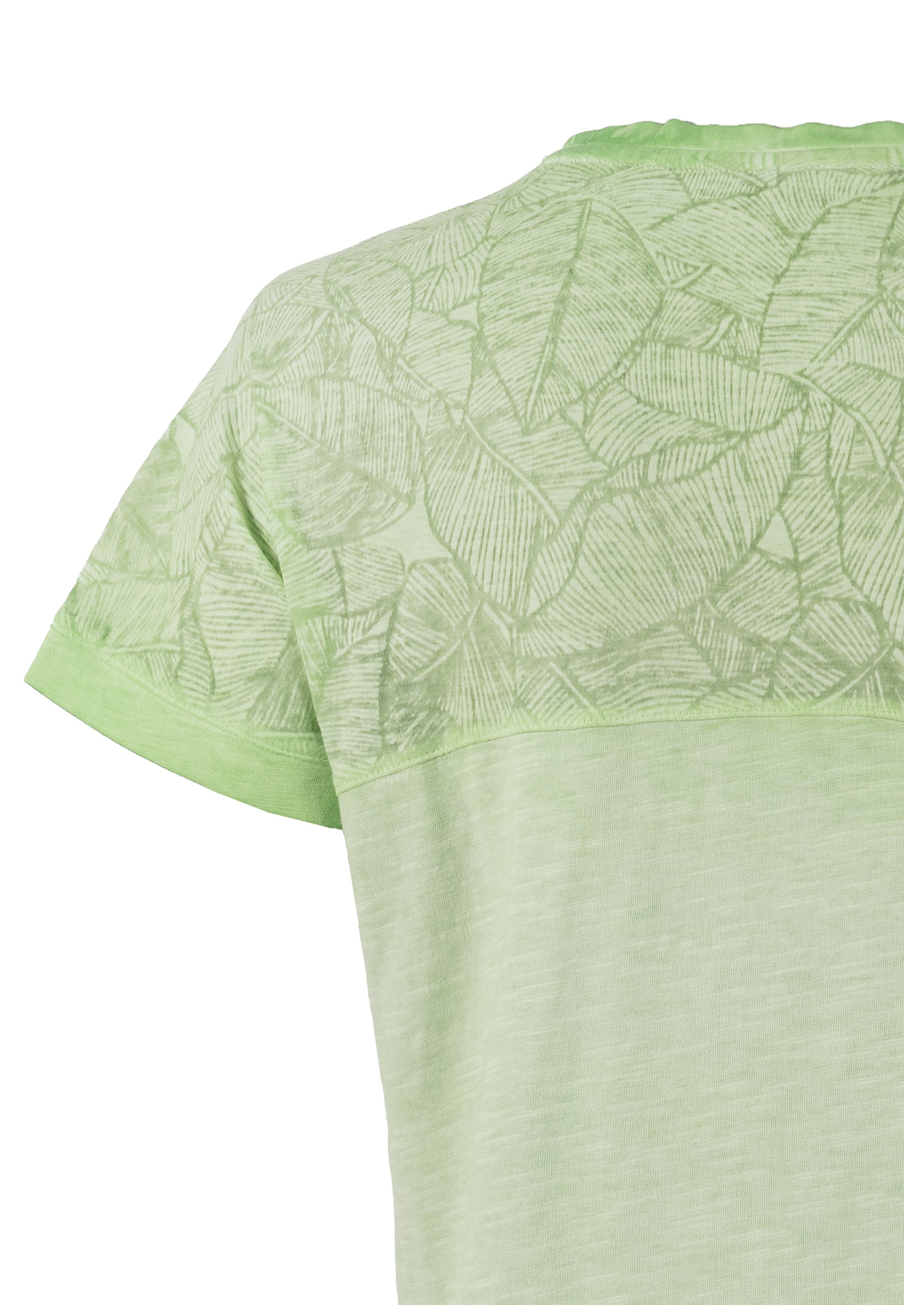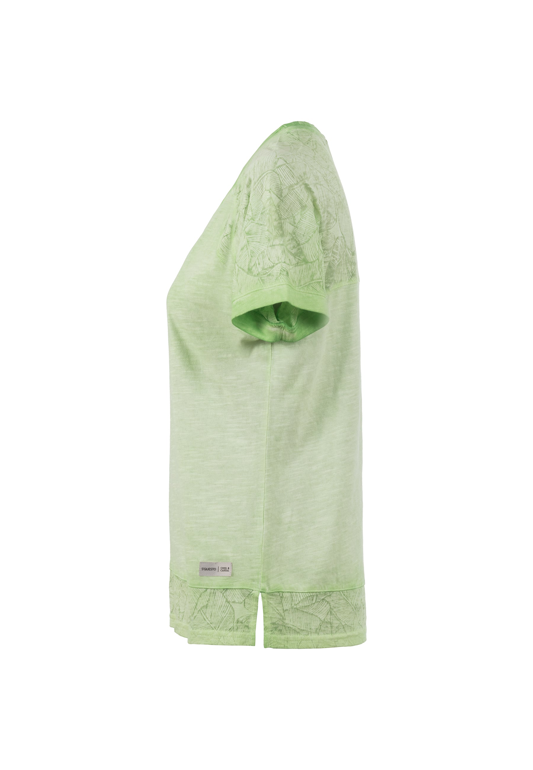 Floral Burn-Out-Motiv an den Ärmeln und am Bund: Die floralen Burn-Out-Motive an den Ärmeln und am Bund setzen stilvolle Akzente und verleihen dem T-Shirt eine feminine und zugleich lässige Note. Diese Details heben das T-Shirt von gewöhnlichen Modellen ab und machen es zu einem besonderen Stück in deiner Garderobe.