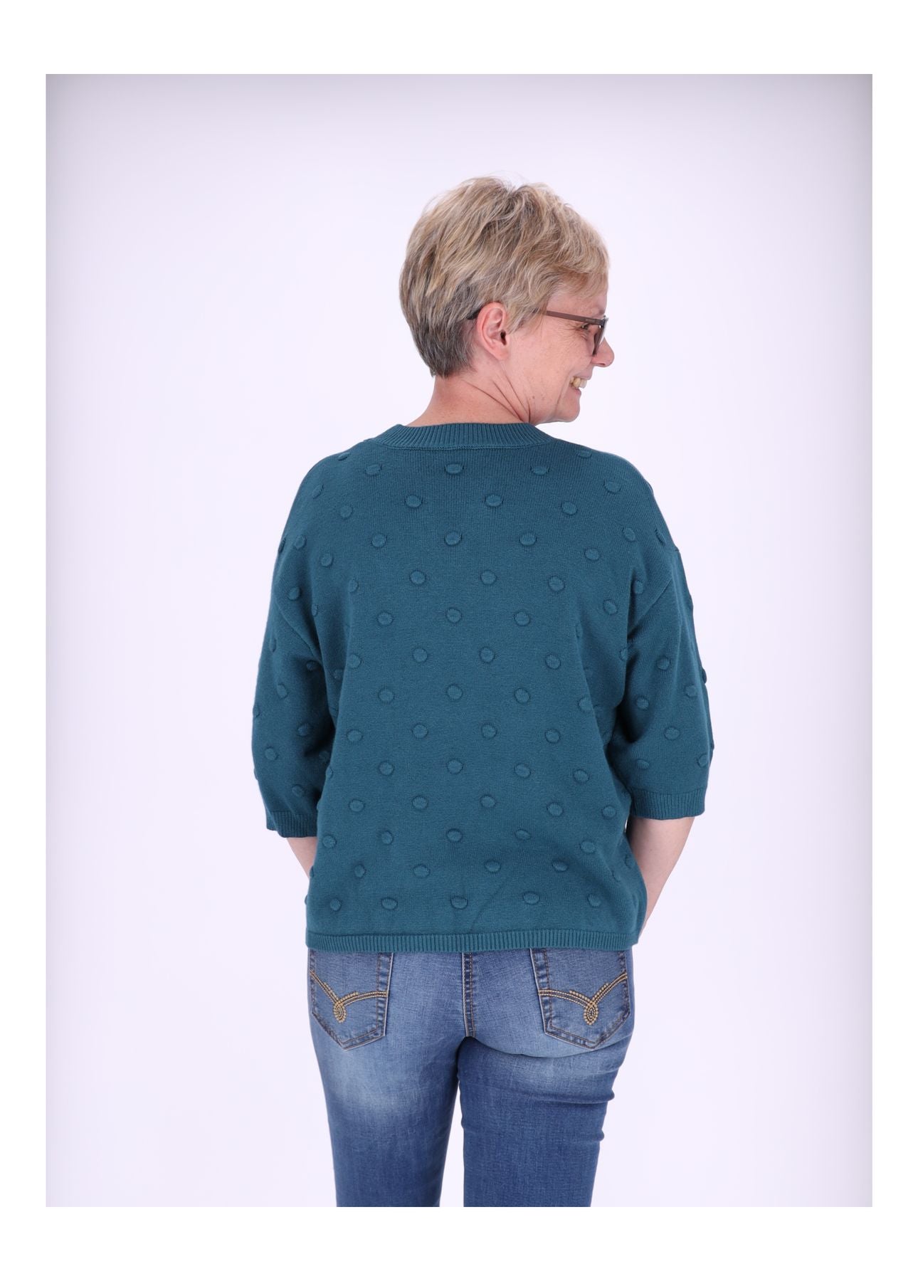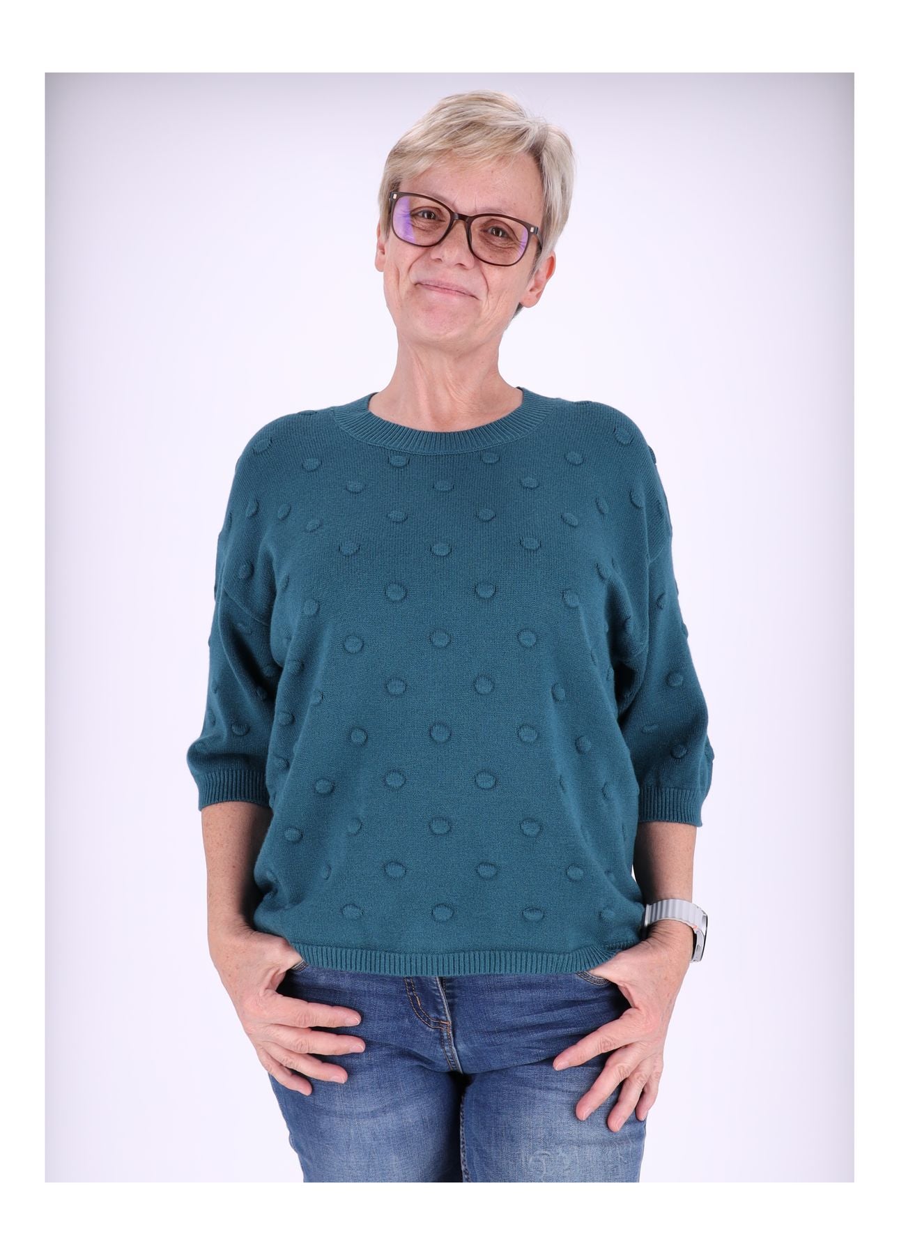 Dieser Damen-Strickpullover vereint zeitlose Eleganz mit einem Hauch von Raffinesse. Das besondere Highlight: feine Punkte, die leicht aus dem Strick hervortreten und dem Pullover eine dezente, edle Struktur verleihen. Der 3/4-Arm sorgt für einen modernen Look und macht ihn perfekt für jede Jahreszeit – ob solo getragen oder kombiniert.