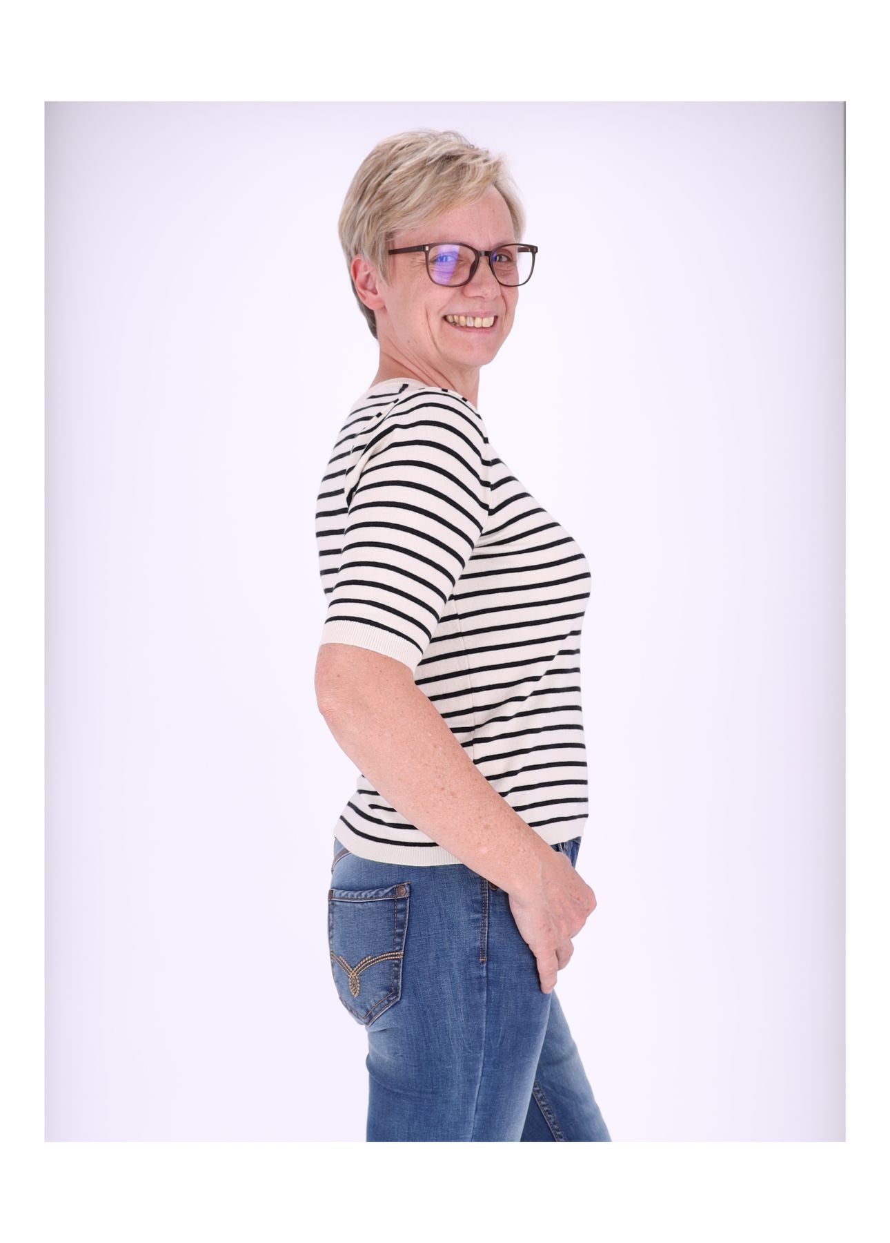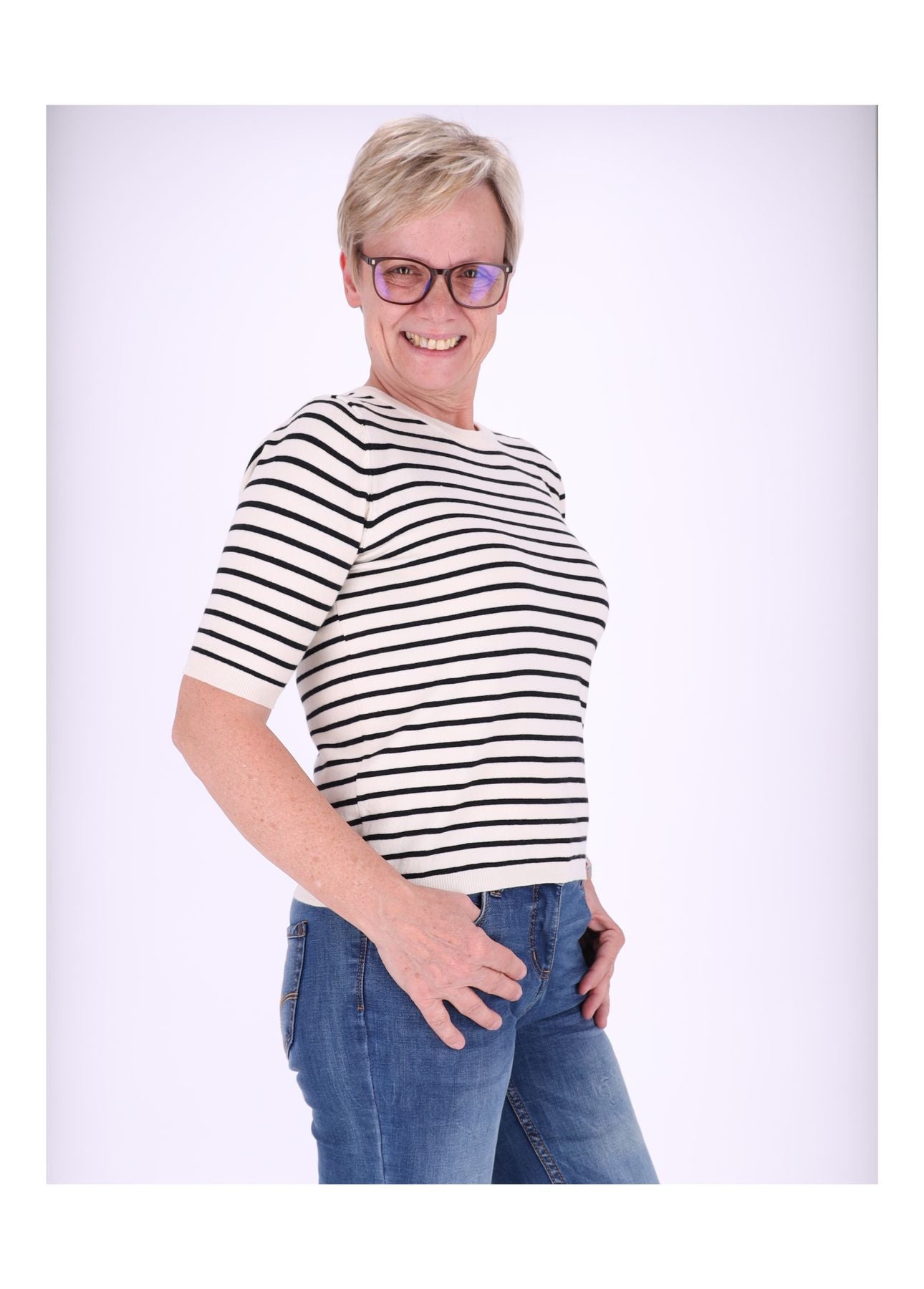 Styling-Tipp: Kombiniere das Ringelshirt mit einer High-Waist-Jeans und weißen Sneakern für einen entspannten Casual-Look oder trage es unter einem Blazer für einen smarten Office-Style.