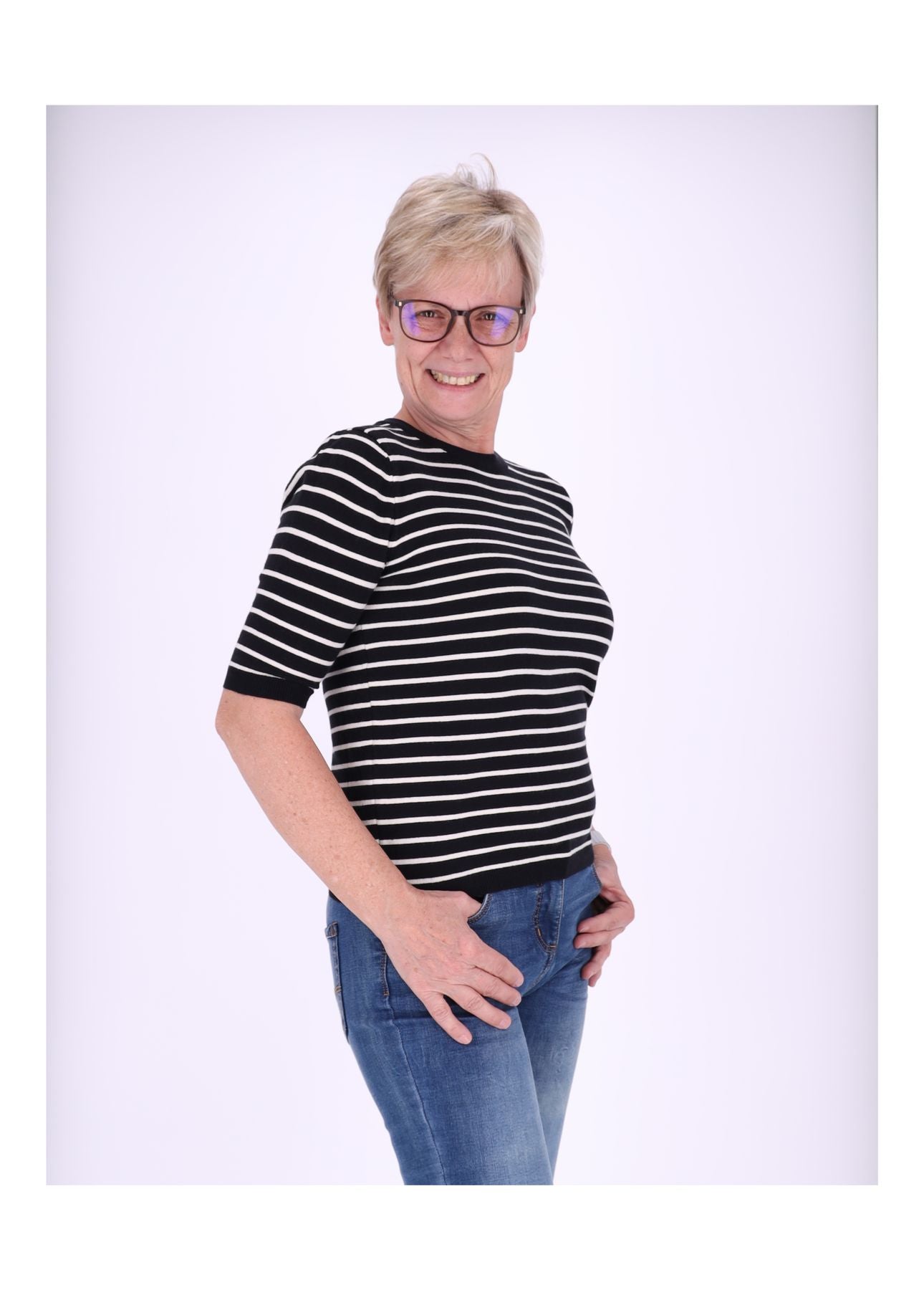 Styling-Tipp: Kombiniere das Ringelshirt mit einer High-Waist-Jeans und weißen Sneakern für einen entspannten Casual-Look oder trage es unter einem Blazer für einen smarten Office-Style.