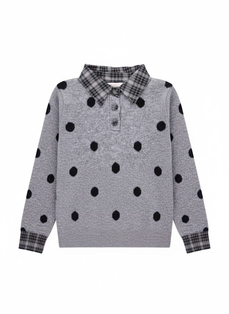 Kuschelweicher Pullover mit modernem Punktmuster – in Grau-Schwarz. Kragen und Ärmelbündchen aus kariertem Hemdstoff setzen einen lässigen Kontrast, die kurze Knopfleiste verleiht eine cleane Note.