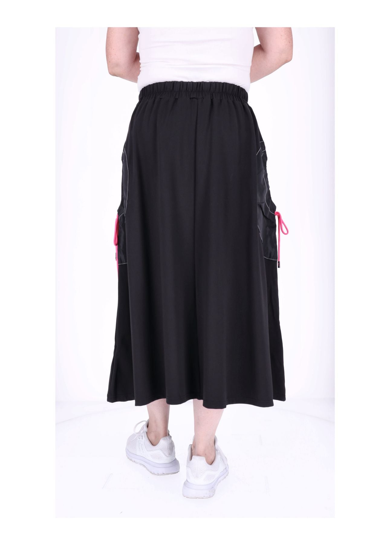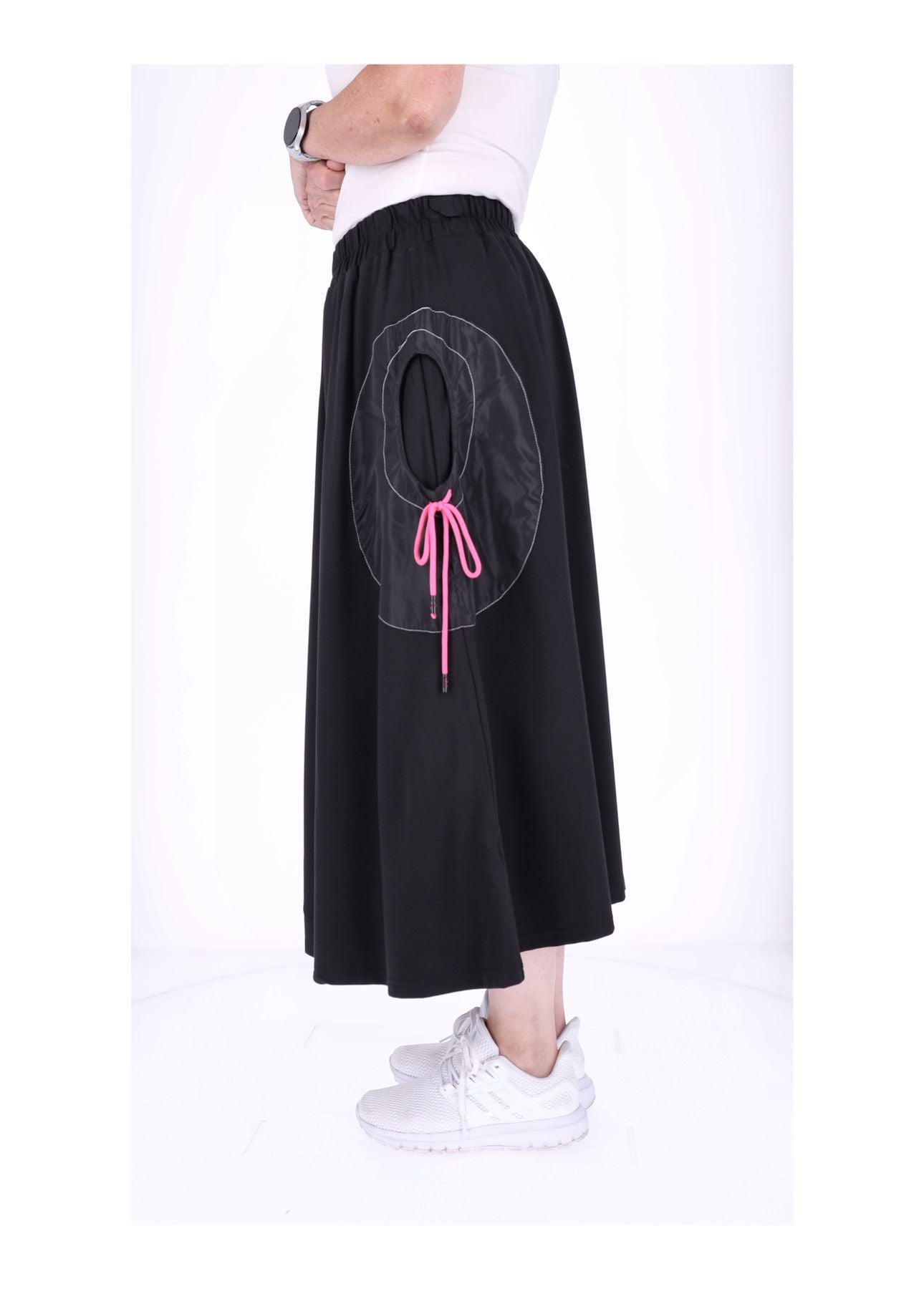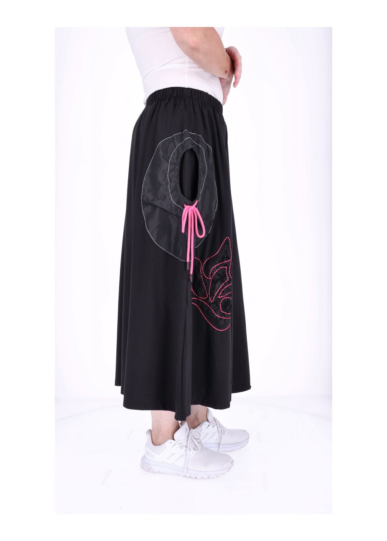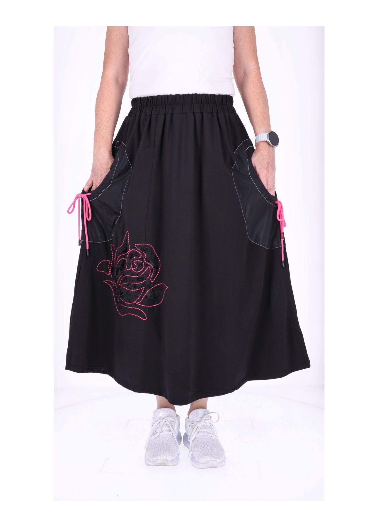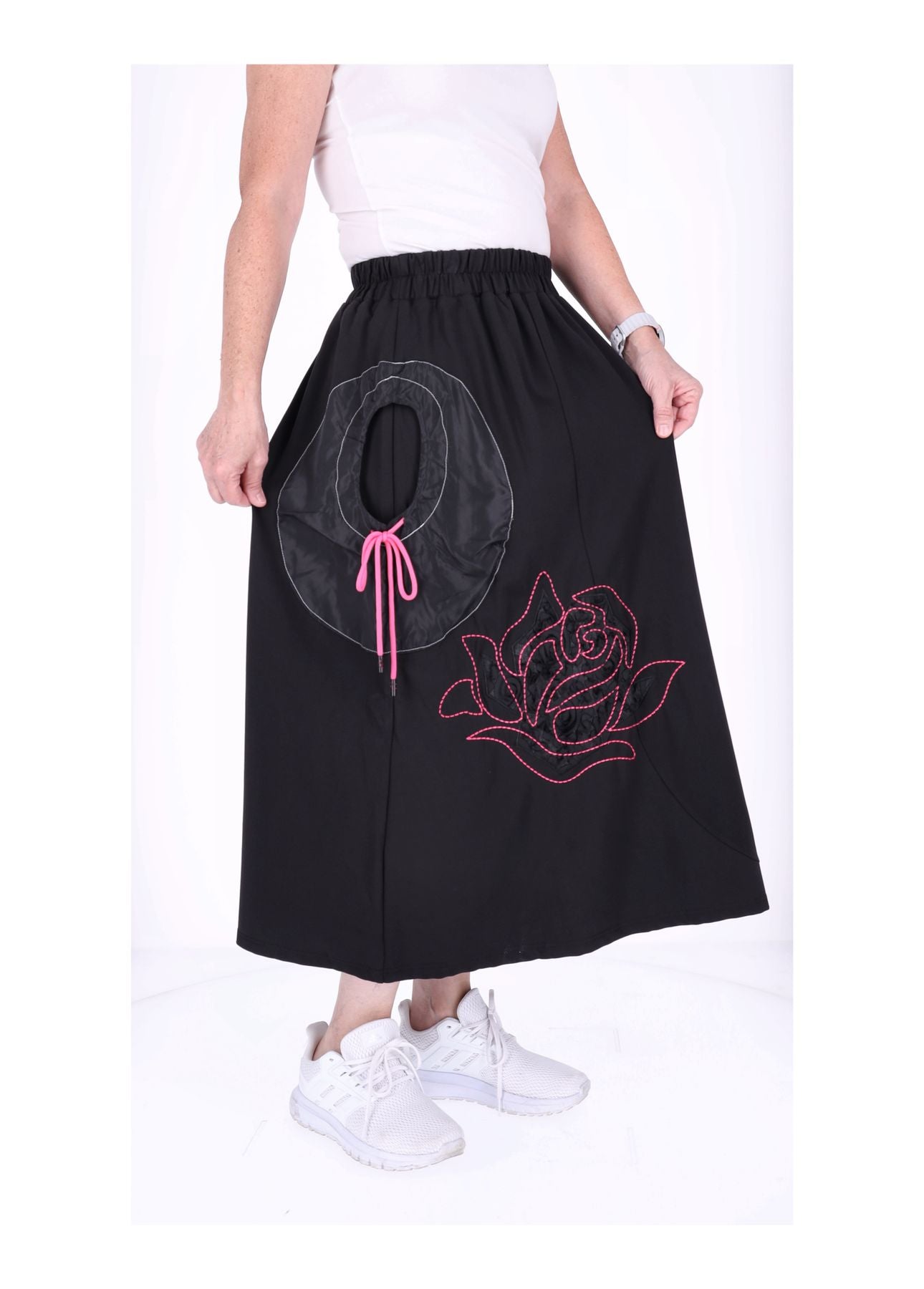 Das besondere Highlight: Eine zarte Blume ist vorne liebevoll gestickt und appliziert, die den Rock zu einem echten Hingucker macht. Die praktischen Taschen links und rechts lassen sich durch ein Zugband raffiniert enger ziehen – so entsteht eine charmante Raffung, die deine Silhouette betont und dem Rock ein individuelles, stylisches Finish verleiht.