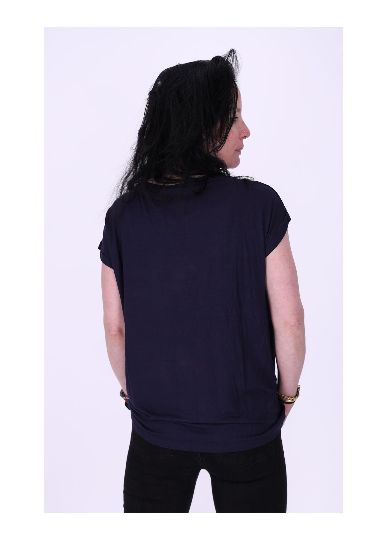 Als stilvolles Highlight ziert ein schimmernder Metallic-Brustprint „Moment“ das Vorderteil – dezent, aber ausdrucksstark. Dieses T-Shirt lässt sich vielseitig kombinieren: ob zur Jeans, zum Rock oder unter einem Blazer – es setzt immer ein smartes Statement mit Wohlfühlgarantie.