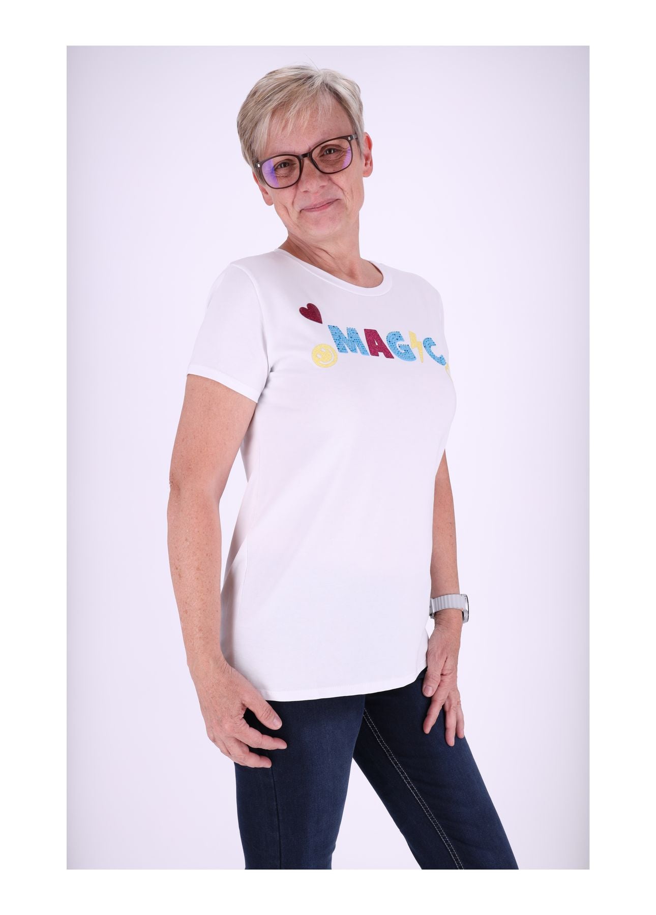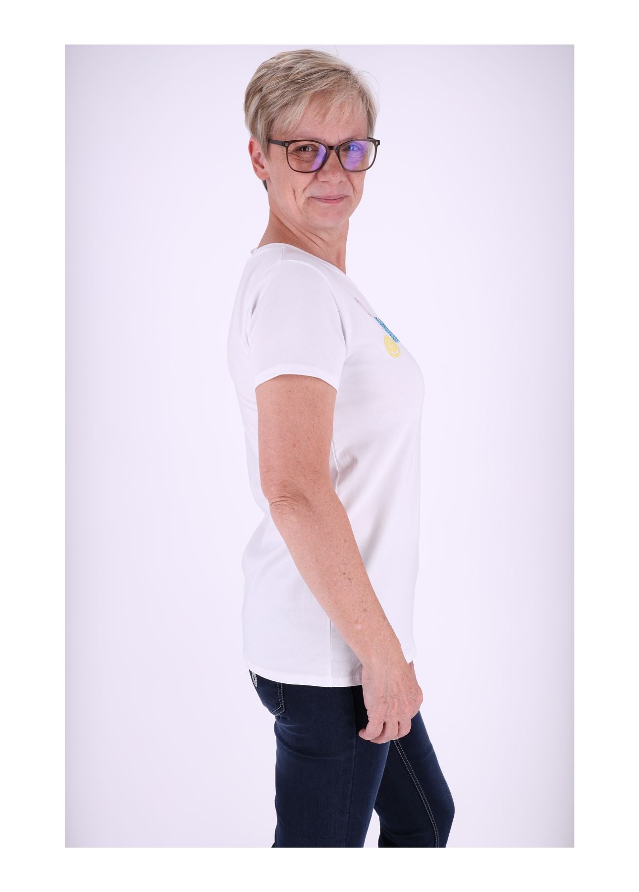Dieses Print-T-Shirt für Damen lässt sich vielseitig kombinieren – ob zu Jeans, Shorts oder Röcken – und setzt mit seinem großen Frontmotiv immer einen trendigen Akzent.