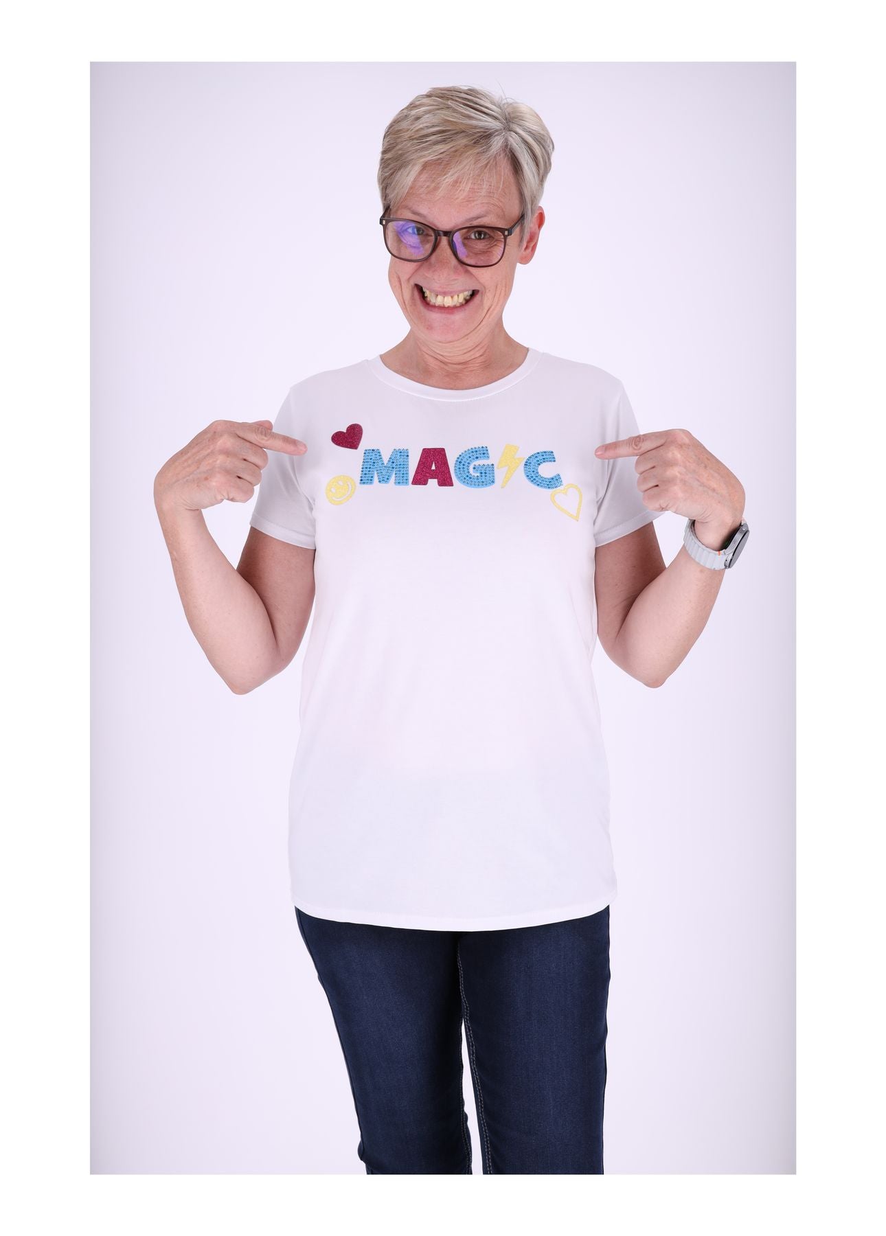 Dieses Damen T-Shirt mit auffälligem Frontprint ist ein echtes Statement-Piece für alle, die bequeme Mode mit Hingucker-Effekt lieben. Der große Print auf der Vorderseite macht das Shirt zum stylischen Mittelpunkt deines Outfits, während der klassische Rundhalsausschnitt und die kurzen Ärmel für einen zeitlosen, lässigen Look sorgen.