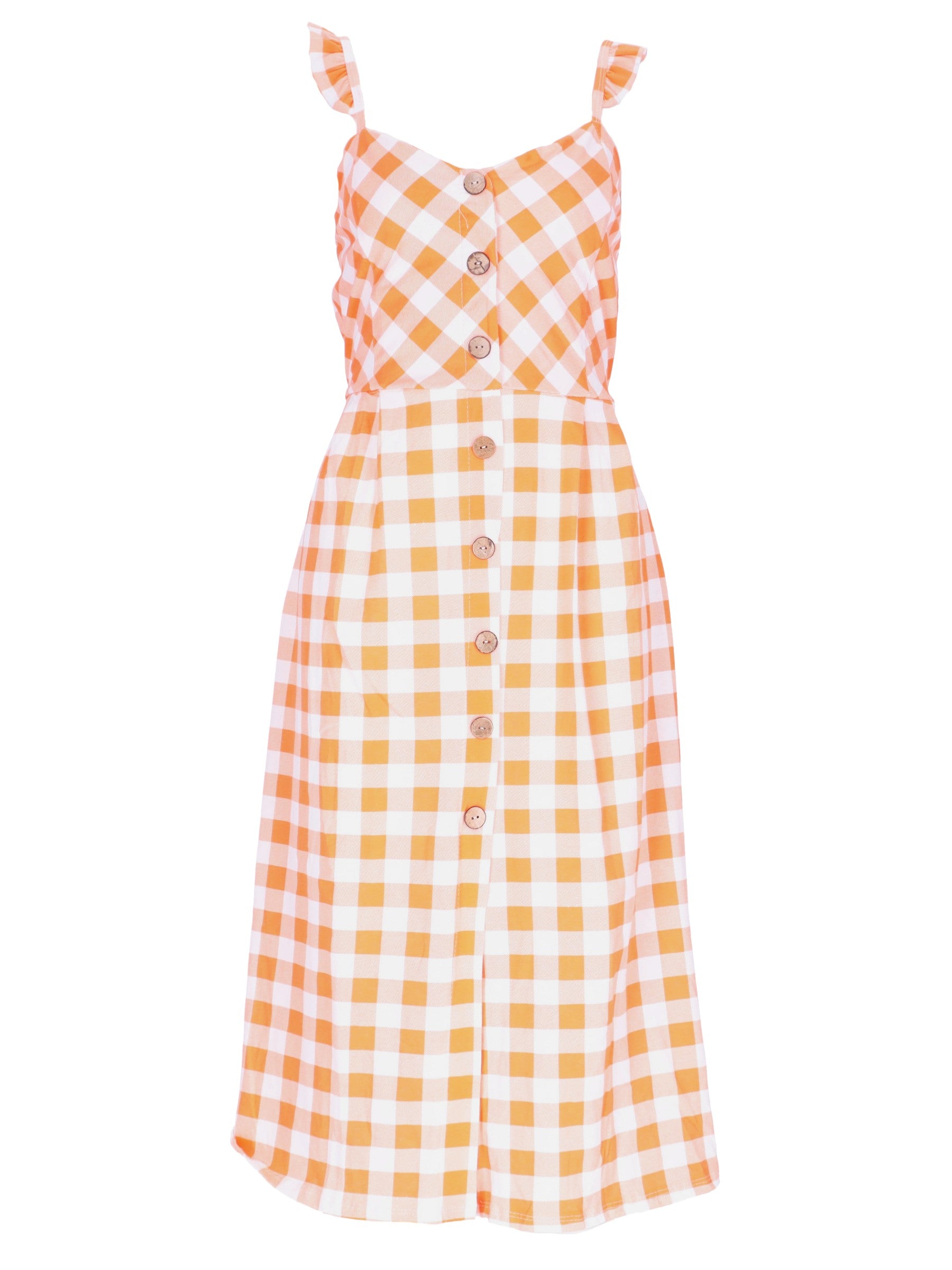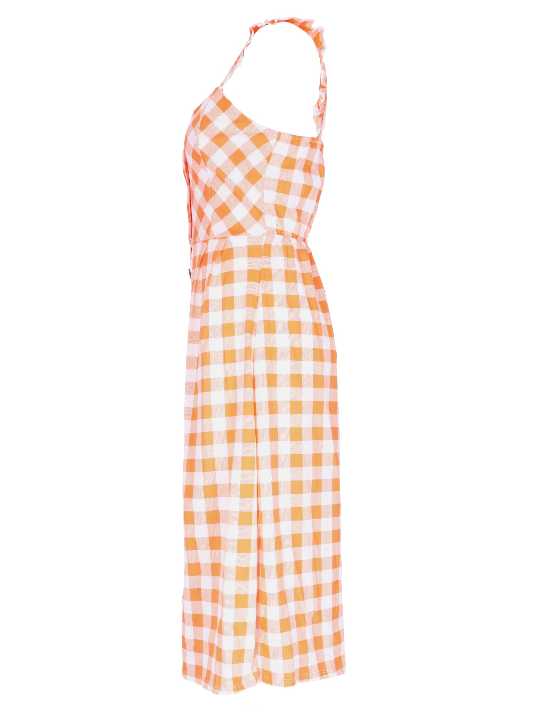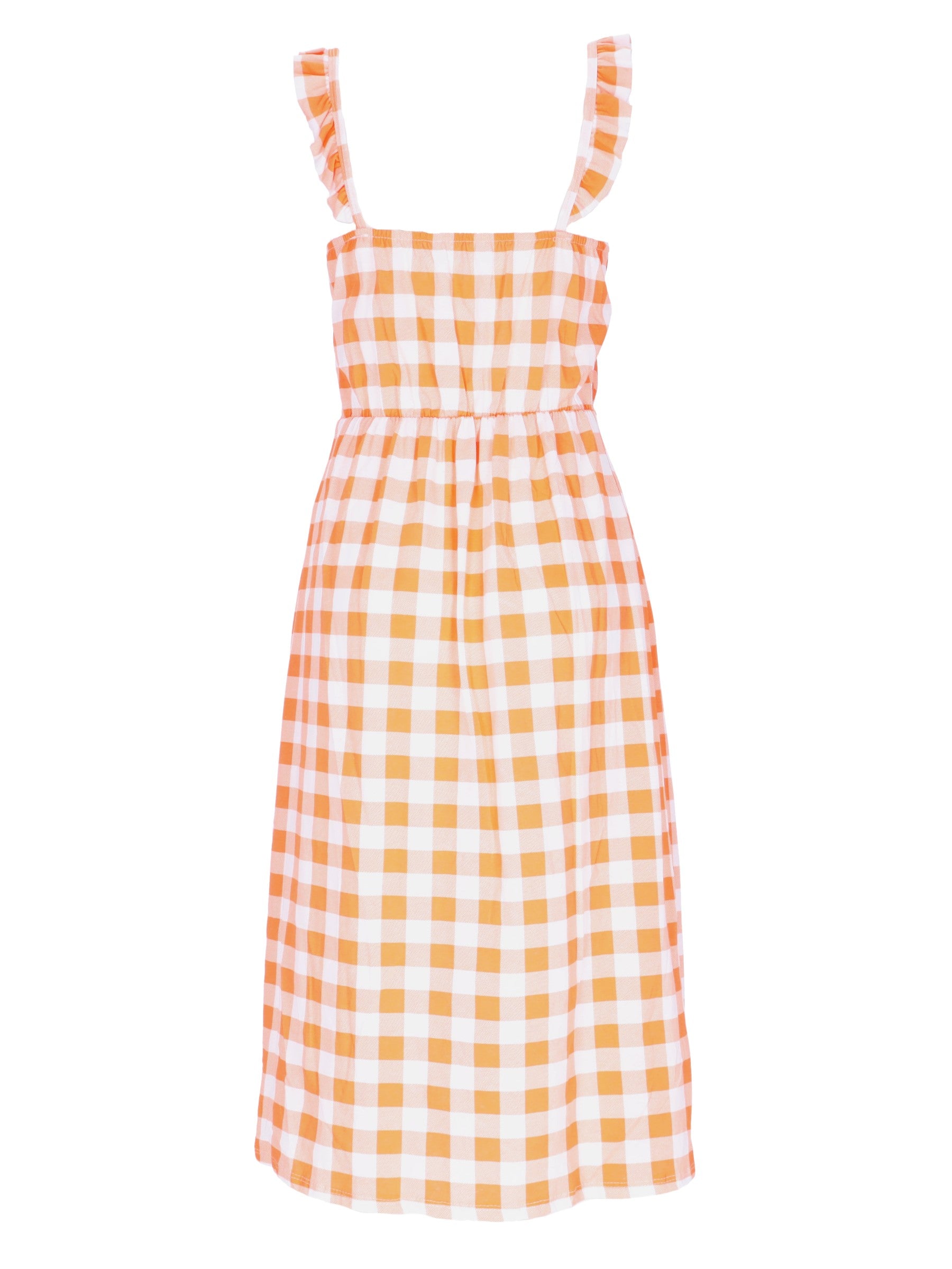Die zarten Spaghettiträger mit kleinen Rüschen verleihen dem Kleid eine verspielte Note und machen es ideal für warme Sommertage. Erhältlich in den klassischen Mustern Karo oder Streifen, ist dieses Kleid sowohl zeitlos als auch vielseitig kombinierbar.