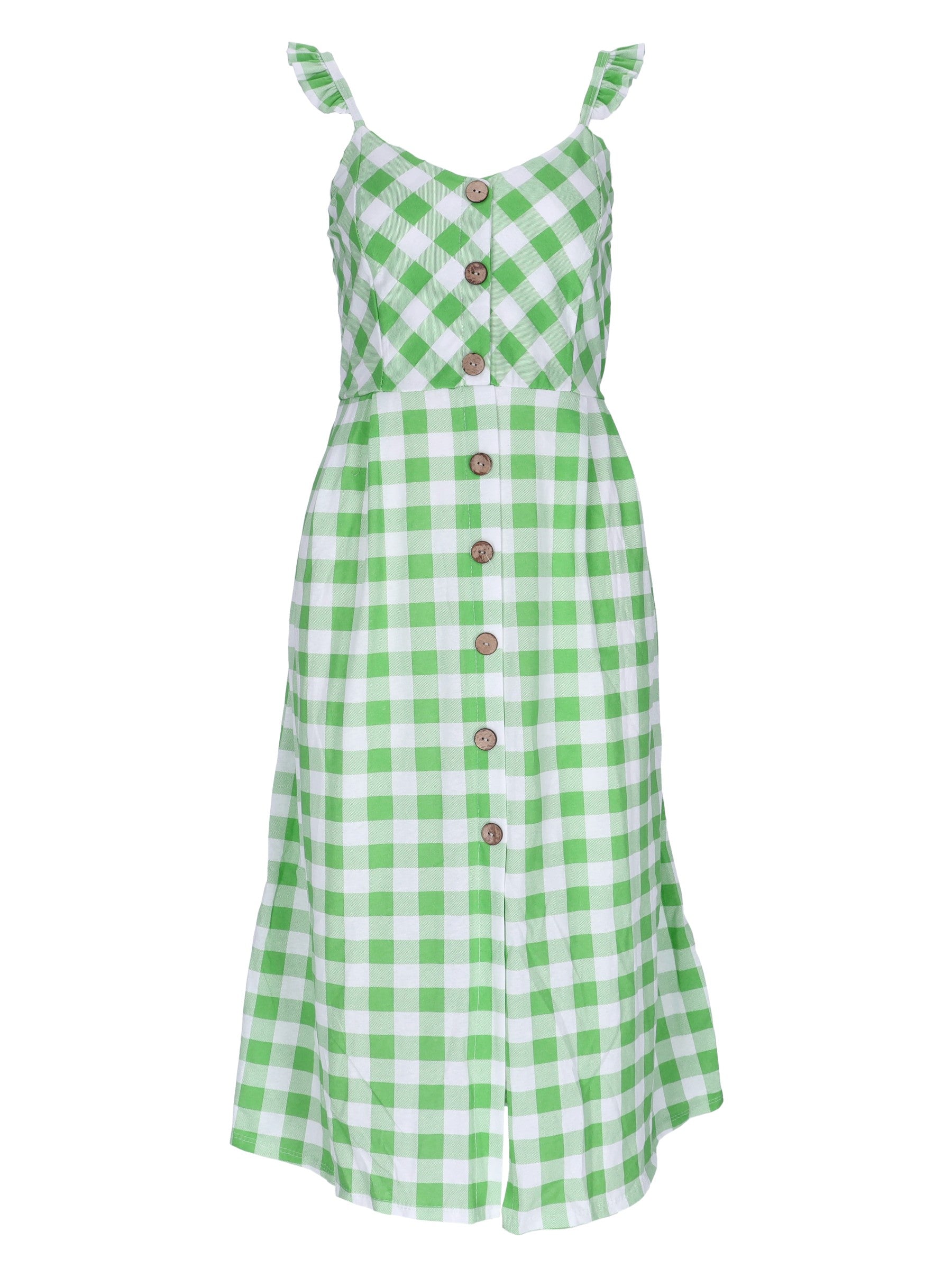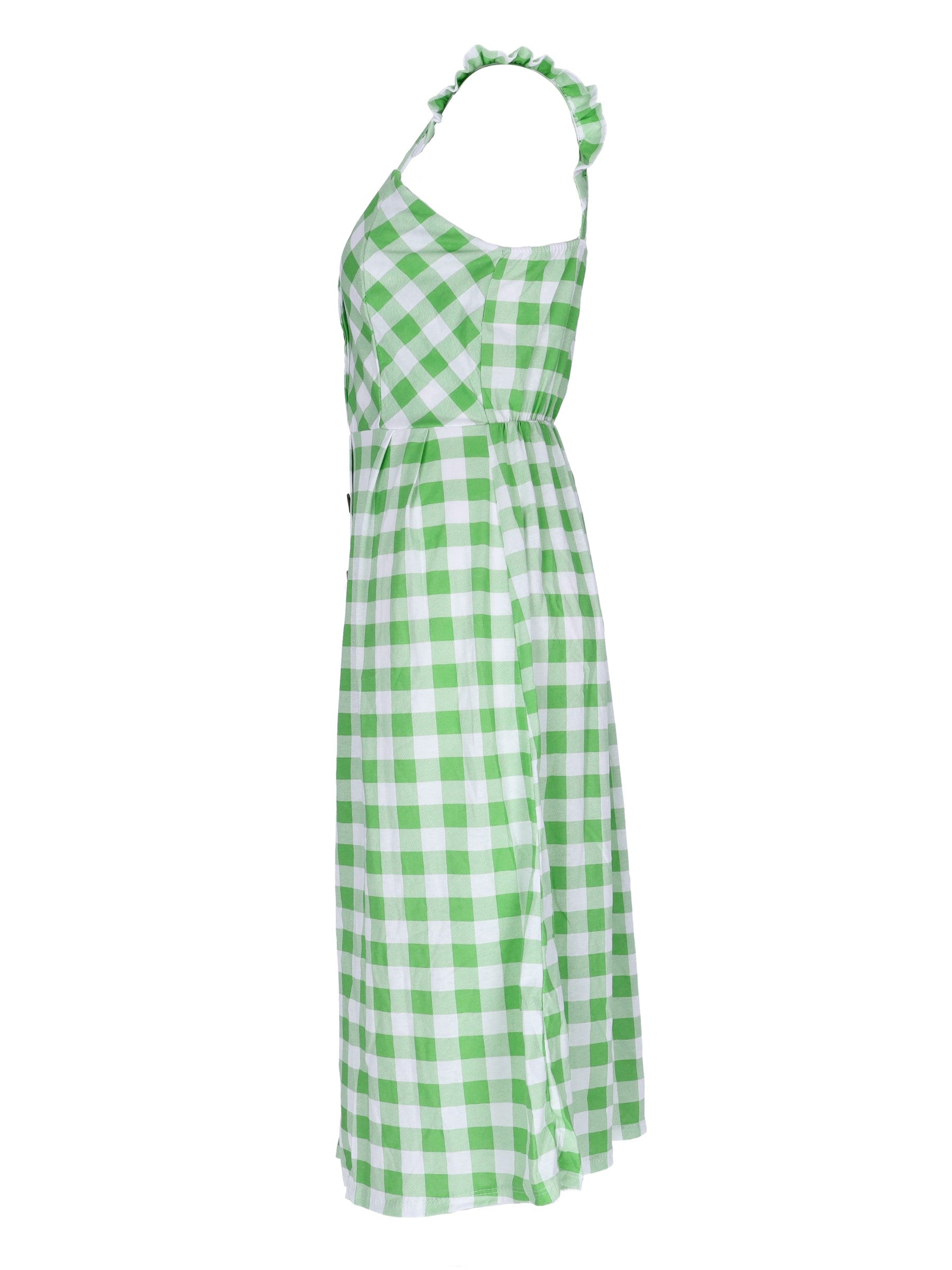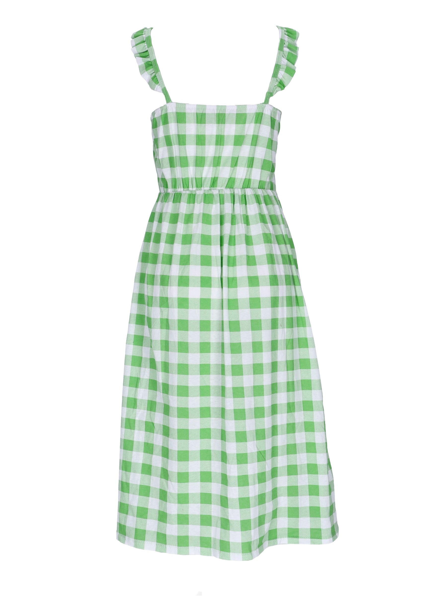 Die zarten Spaghettiträger mit kleinen Rüschen verleihen dem Kleid eine verspielte Note und machen es ideal für warme Sommertage. Erhältlich in den klassischen Mustern Karo oder Streifen, ist dieses Kleid sowohl zeitlos als auch vielseitig kombinierbar.